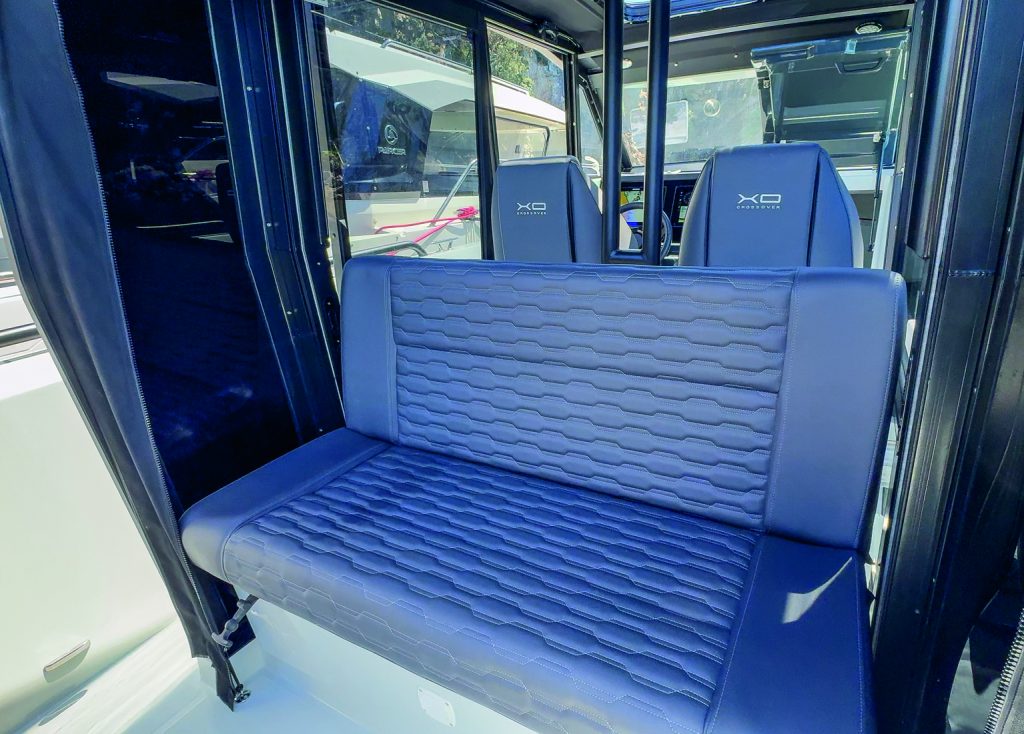Tracks and domes prevent squabs and backrests from blowing off, though it’s advisable to stow them when underway. Or you can leave the squabs stowed below and cast lures from the bow for sport fish instead.