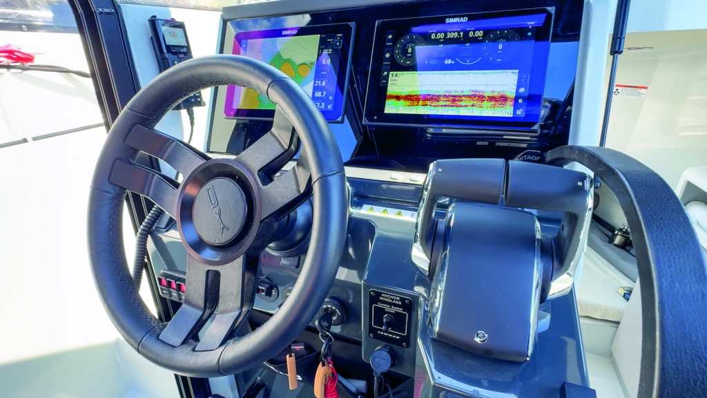Seated at the helm, there’s excellent support from the footrests (the passenger seat footrest folds out from the seat; the helmsman’s is fixed to the bulkhead), great vision in every direction through the glasshouse, and plenty of well-positioned handholds. The console has ample space for displays – a pair of Simrad MFDs, along with the usual array of ignition switches and breakers; anchor, bow thruster, and Lenco trim tab controls; Mercury throttle and shift; and the locking latch to open the companionway hatch door, which opens upwards on gas struts.