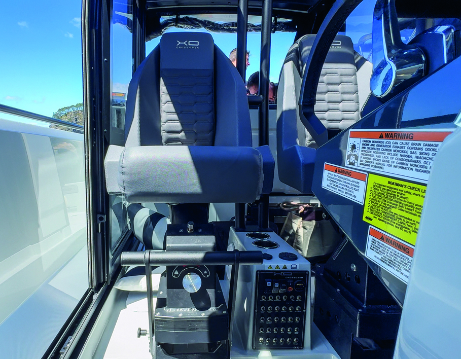 Encouraged by its evident ability, we pushed the XO in bigger seas, giving the Mercurys their head and trimming them well out, once again topping 46 knots. And while it got a little loose at the top end, fully trimmed out, the vessel’s handling at higher speeds is generally stable and confidence-inspiring.