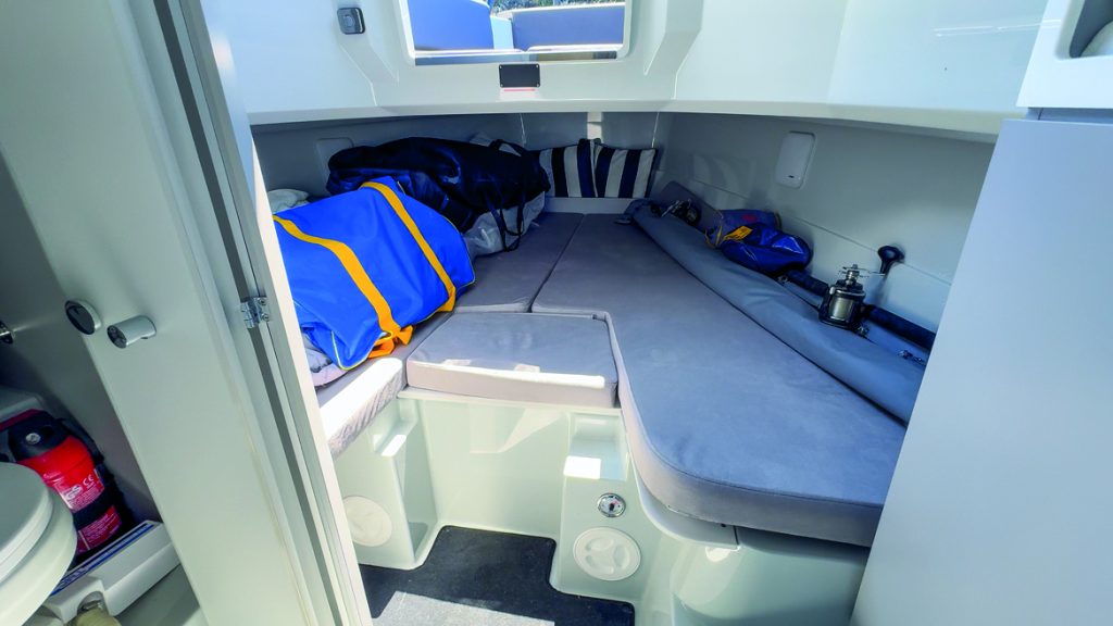 With 450 litres of fuel and 100 litres of water on board, long journeys and overnighters become not only possible but also comfortable. Storage is reasonably generous, there’s concealed LED lighting, and a large ceiling hatch/skylight provides access to the foredeck and cabin ventilation.
