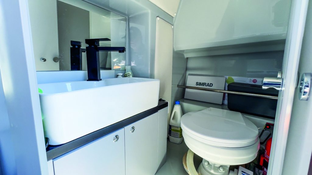 Access to the forward cabin is on the starboard side via steps. Every aspect of the interior speaks to thoughtful, high-quality craftsmanship. The cabin extends under the foredeck, so the ceiling is low over the full-length V-berths, but there’s standing headroom near the entrance where a separate heads compartment with a small vanity and bi-fold doors is situated – no cramped under-bed toilet here. Lifting the berth squabs reveals the stainless steel fuel, water and holding tanks, positioned forward to balance the boat, and speakers for the Fusion sound system also feature inside the cabin.