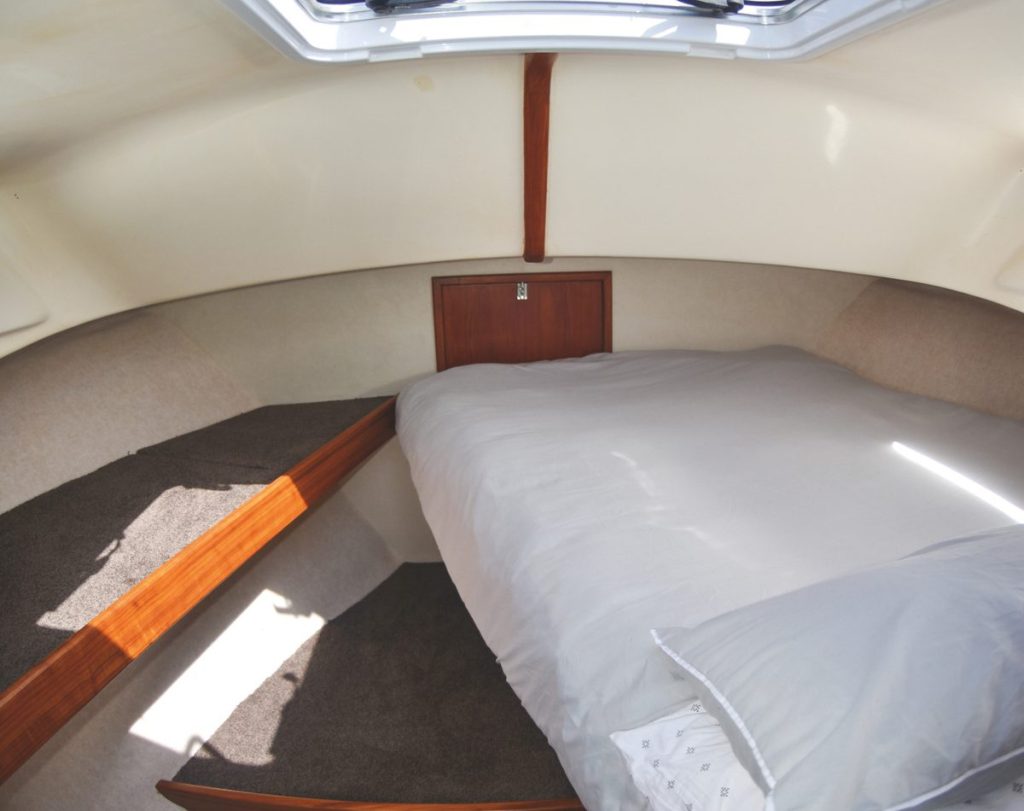 The forepeak too, has benefitted from the redesign – it now boasts a much larger double bed (offset to starboard), with a parcel shelf to port. The single bathroom (just aft of the forepeak, to port) has also enjoyed a rework and is much brighter thanks to the new windows in the cabin sides.