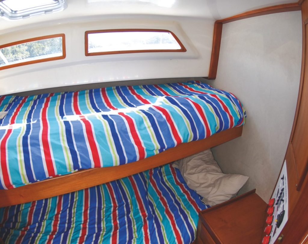 Built in solid teak, it features a creative use of the timber’s grain. Even better, its legs are mounted on extended ‘sliders’ that slip under the starboard settee. While this provides stability while under way, it also means the table’s position is variable – it’s easily shifted into the centre of the saloon to accommodate dinner guests seated on the port settee.