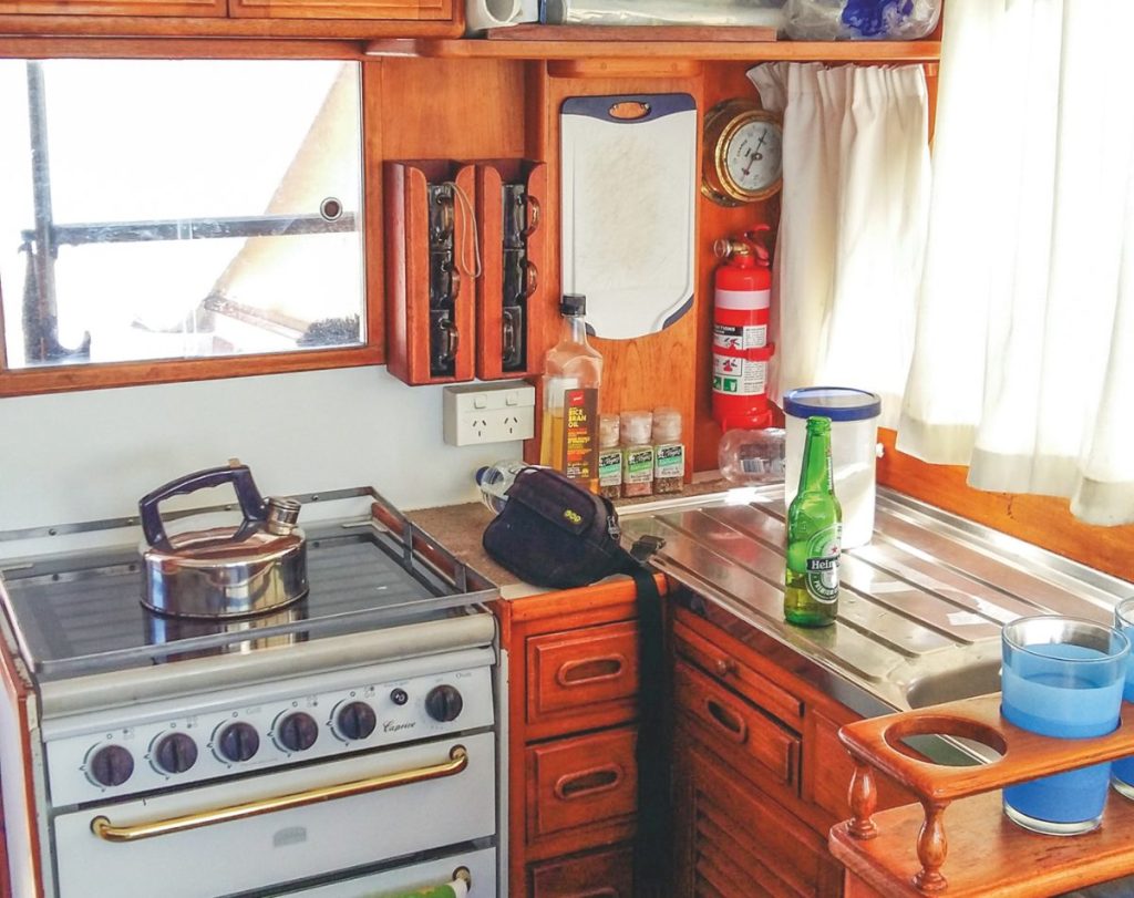 The old lady has also enjoyed a complete rewire and replumb and her electrical system is now powered by two lead crystal batteries (approximately 300 amp-hours). Two 70-watt solar panels on the roof are easily able to keep them (and the four electric fridges) in the happy zone. Other modern conveniences include a bow thruster and underwater LEDs at the stern – a helpful beacon identifying party central for any late-arriving guests who may have pre-loaded before dinner.