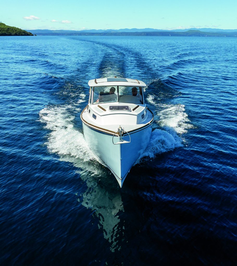 Pushing the throttle all the way forward propelled the boat to an indicated 15 knots on the 9-inch Garmin MFD, which displayed engine, speed, and navigation data. That’s with four adults aboard and a partial load of fuel and water.