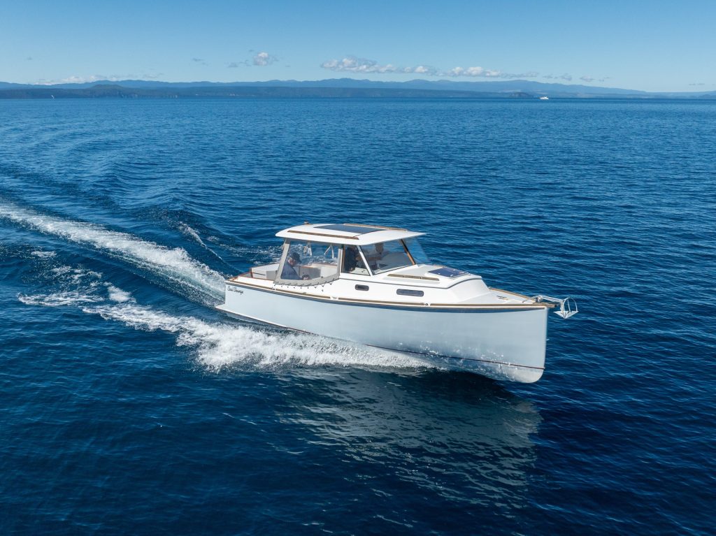 Another knot or two might be possible in light trim, while 14 knots is probably more realistic with 130 litres of fuel in the belly, 150 litres of freshwater, and a full complement of gear and crew. The fuel and water tanks are situated low down in the hull for stability, so while this is a round-bilged, narrow vessel, especially forward of the helm, stability at rest is rather good, and the short keel ensures it tracks straight under power. From some angles Cool Change underway almost looks like a WWI destroyer, which isn’t too surprising since high speed naval vessels also exploited fine bows and extreme beam-to-waterline ratios.