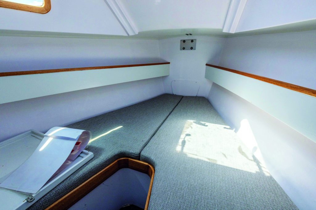 Like the cockpit layout, the v-berth forward cabin is arranged simply and with practicality in mind. Directly in front of the helm is an enclosed head, equipped with a chemical toilet, a small mirror, a shelf, a shallow storage locker, and a small portlight. There’s seated headroom, and it’s quite spacious for the boat’s size.