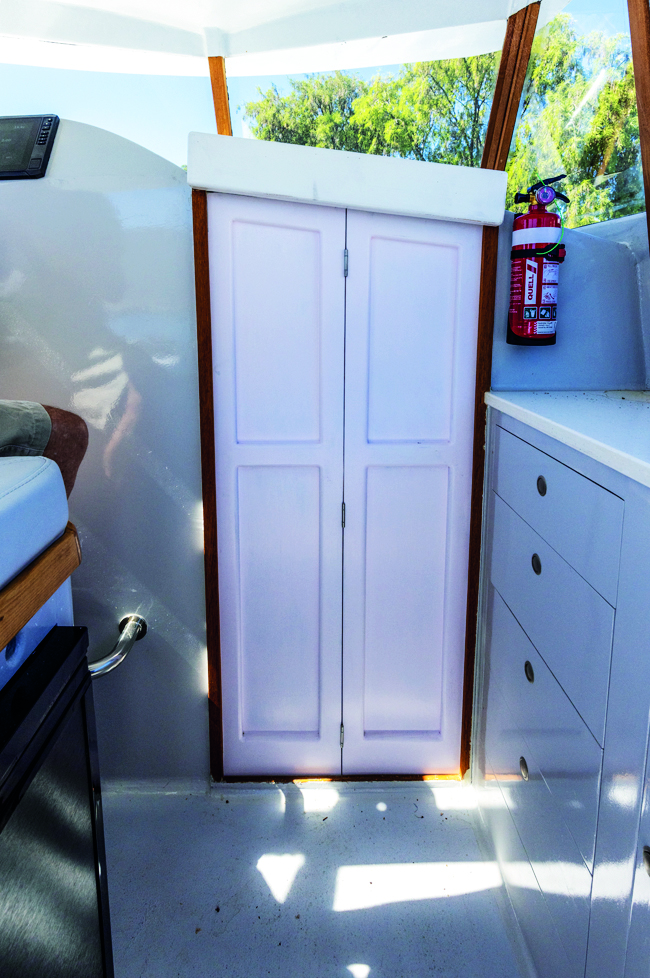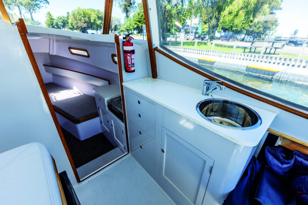 The galley is split between the forward cabin and the cockpit. The forward cabin gets the two-burner gas cooker, some food prep bench space, plus a bit of drawer storage. The cockpit gets the sink, more bench space, and additional drawer and locker storage opposite the helm station – the fridge is tucked under the helm seat. Although the galley is at different levels, it works well.