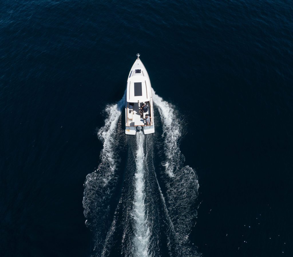 This speed advantage is attained by a combination of very light displacement (weight), a long waterline length with a very fine entry to cut through the water, and a flat run aft. The boat is widest at the transom, and seen from above (or below), it’s shaped very much like an arrowhead.