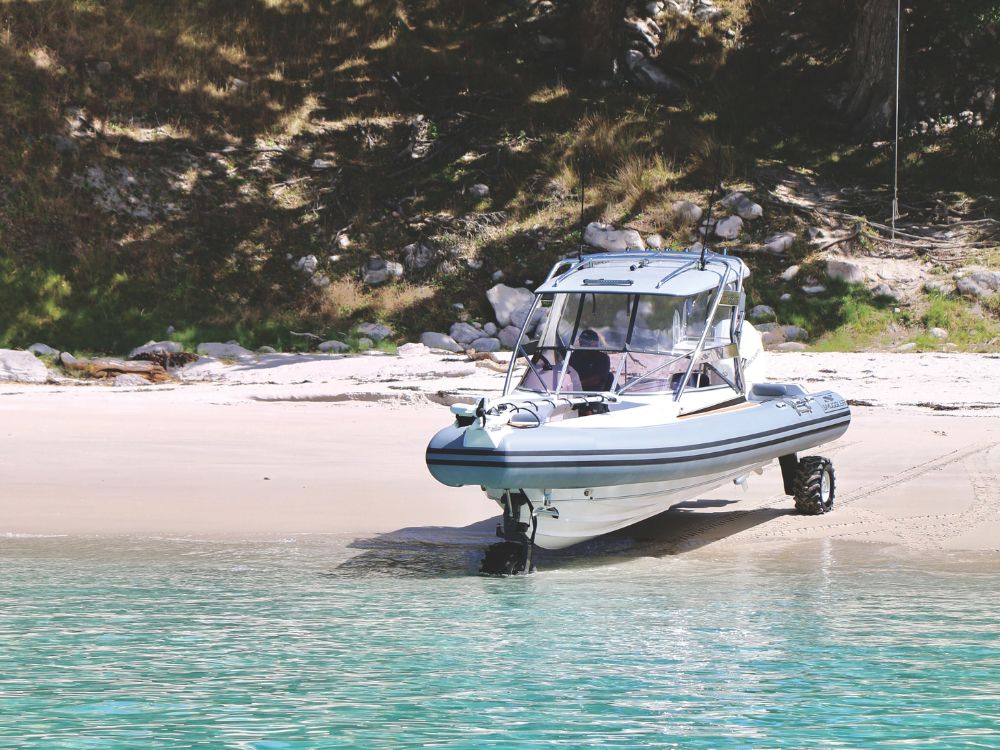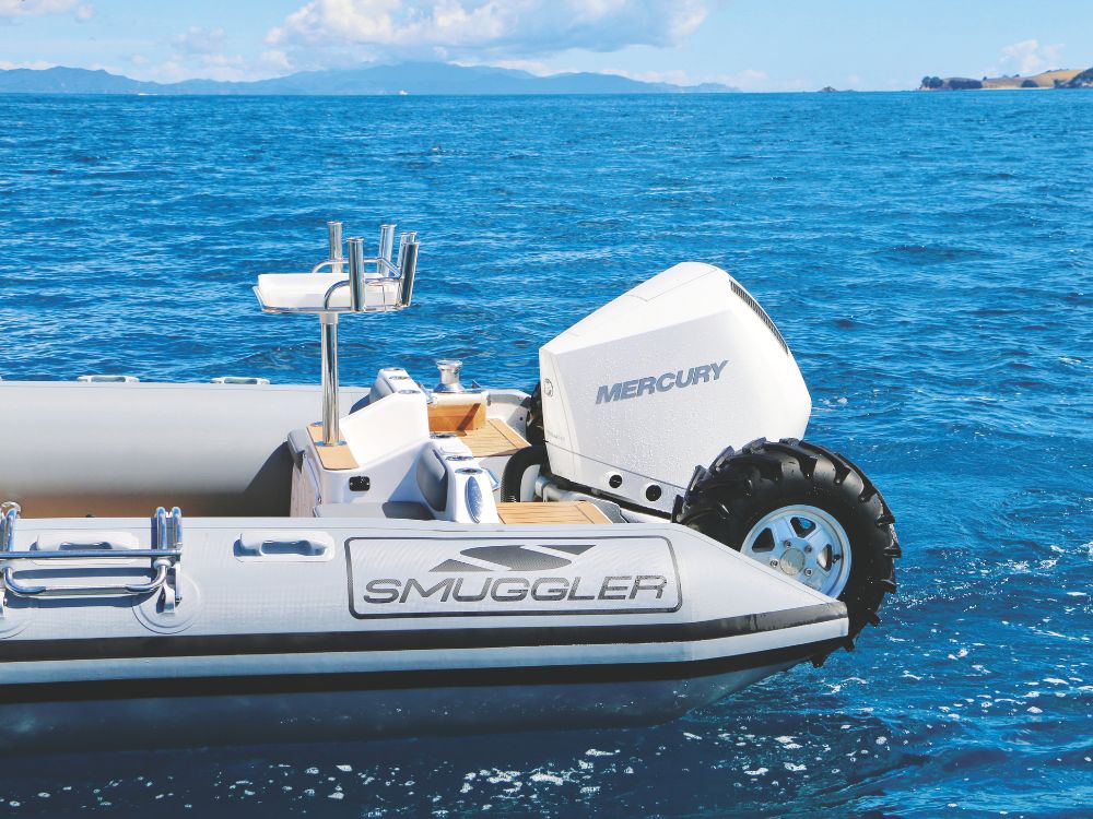 It’s based on the popular Smuggler 780 Super Sport RIB, with the addition of an amphibious setup: three permanent wheels, driven by an electric-over-hydraulic system designed by Kiwi company Anura. This new-generation 28 kW electric engine saves weight and removes the logistical hassle of having a separate petrol-driven motor to run on-land operations while still offering the proven reliability of hydraulic operation. It’s also quieter than a petrol engine – and there are no smelly fumes.