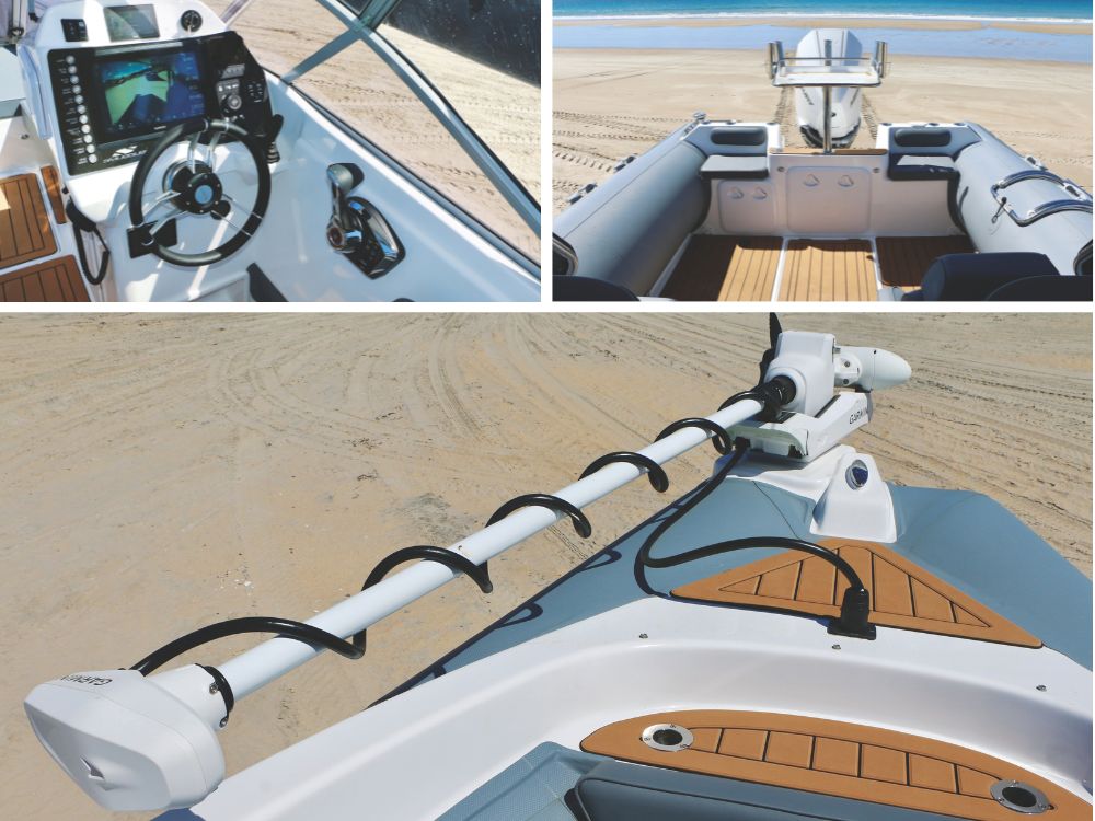 The inflatable tubes are in a carbon-finish Hypalon, which creates a non-reflective, satin surface with a slight woven texture. This means the tubes don’t heat up so much in the sunshine and are grippier to touch or walk on. The tubes taper to a point at the back, providing support and buoyancy aft; another advantage of having the electric engine driving the hydraulic gear is no petrol engine exhaust coming out of a hole in the transom here.