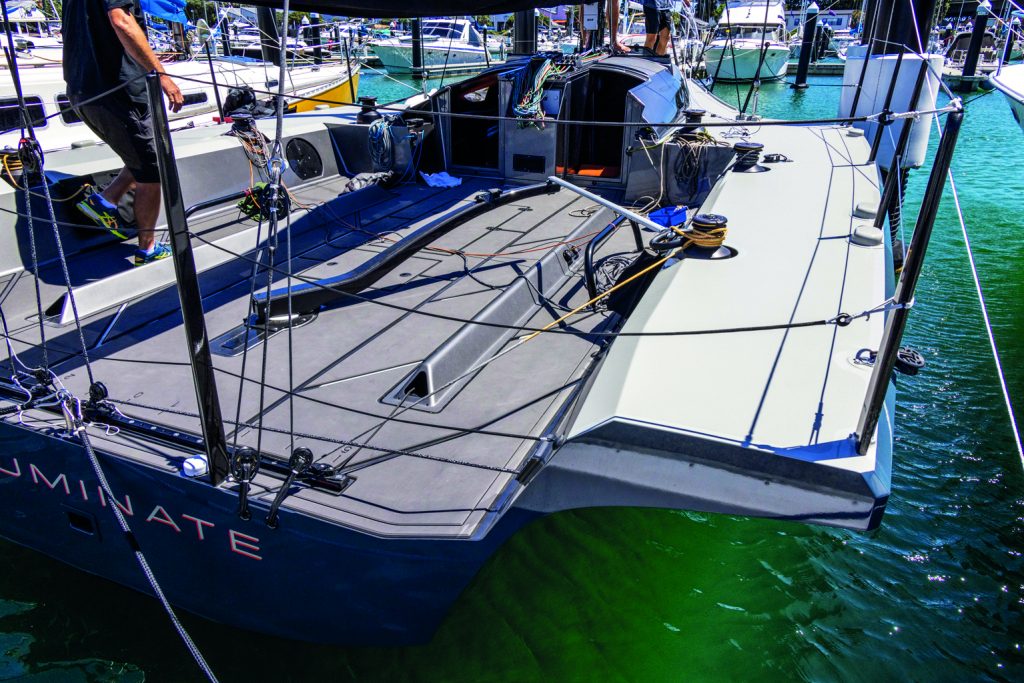 Illuminate is tiller-steered, like a big dinghy, and two-metre-long extension provides fingertip-control of the beautifully finished carbon tiller and the through-hull rudder beneath it. The traveller is mounted across the stern, the continuous mainsheet running forward in a tube under the deck on each side to winches forward of the helm position. Controls for the traveller itself run forward inside the generous foot chocks.