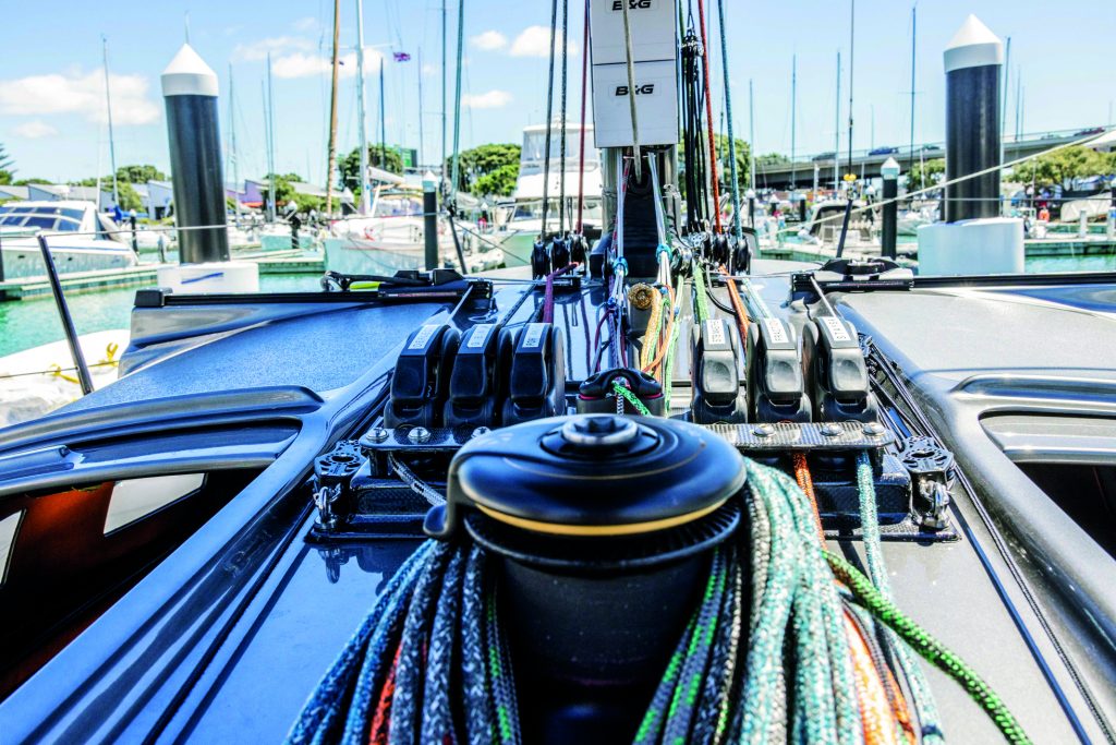 There’s another pair of winches on the side decks further aft, for the running backstays, and a third pair on the side deck next to the cabintop, for jib trim. All these winches are Karver, and are four-speed, changing gear automatically as load comes on to provide improved speed and control when trimming (particularly useful when hauling in the main or when gybing the gennaker and needing to get lots of sheet in fast, the crew report). A bank of Harken clutches and a dedicated winch for sail control lines sit on a central member between the twin companionways. The cockpit floor is covered in panels of soft yet grippy U-Dek, with a non-skid paint finish on the wings and side decks.