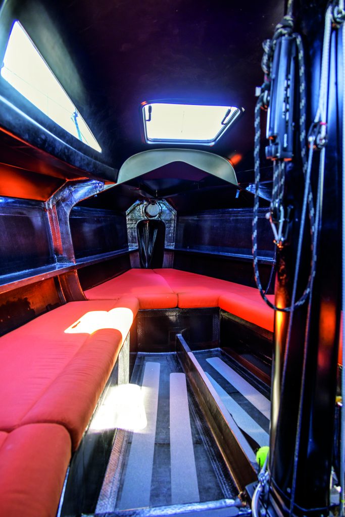 The result is a sleek-looking raceboat with a touch of the aircraft carrier about it: a hugely wide cockpit with wings containing water ballast, tapering to a narrower shape forward with a low-profile cabin and angled topsides with a generous gunwale bevel to minimise weight and windage. And a plumb bow. Part of the prod is fixed, with a bob stay, to generate plenty of luff tension when tight reaching under a code zero, plus there’s a retractable extension for flying asymmetrical sails. Graphics on the bow and wide, open transom spell out the name, chosen by Fyfe’s kids after a drum-and-bass track by Wilkinson. (Afterglow, the title of another Wilkinson banger, was already taken.) This is a boat that looks like it means business, and painted a striking shade of metallic charcoal it is certainly one to turn heads out on the racecourse.