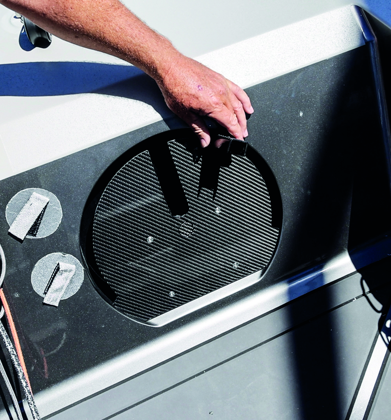 There are some particularly nice touches, such as the custom-made circular throttle control for the 20hp outboard (tucked away in a well under the cockpit floor), set into the side of the port ballast tank, made by Grant McKinnon of Wind Warrior Yachts. McKinnon also developed the headboard system with enables the square-top main to be hoisted and locked off. The crew are taking their time to come to terms with all the bells and whistles and cool systems; as Bettany says, “There are so many Gucci things even we don’t know how it all works.”