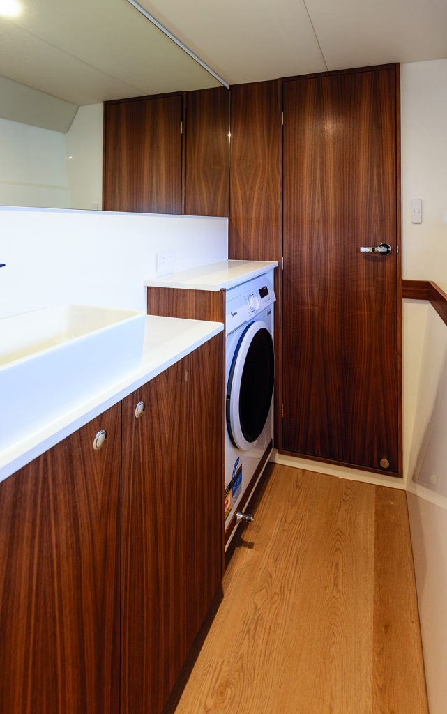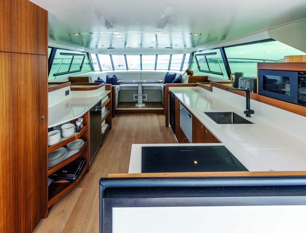This flybridge version of Wright’s cat design with the helm station up top benefits from extra living space in the saloon. Instead of the helm console dominating the saloon, the builders have instead wrapped a raised seating area around the saloon table under the front windows. This has allowed them to go to town with the galley aft, which spreads along both sides of the saloon as far as the companionway stairs. Finished to a high standard and equipped with domestic appliances, stone-look surfaces, ample refrigeration, and plenty of storage, it creates an impressive food prep and entertaining zone, with easy access to the cockpit area. And because cats are inherently stable, conventional shelving can be used for many everyday objects, which probably only need stowing away on especially rough passages.