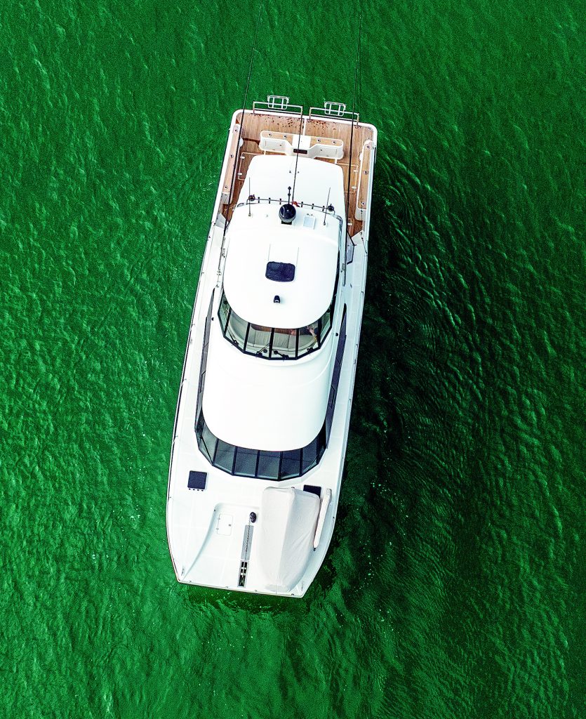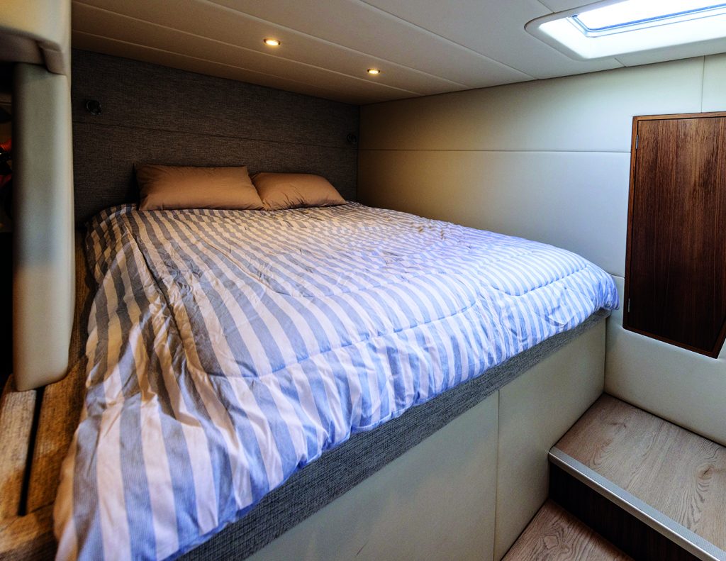 That’s why Catfish has four air-conditioning units, two tucked under the seats in the flybridge and two more built into the saloon, and a large awning over the cockpit, providing sun and rain protection. The cockpit can be fully enclosed with mesh drop covers – insect proof, see-through, and permeable to the breeze. Catfish also has a high-capacity Aquaplumb water maker, a Cummins Onan genset and ample refrigeration onboard. All the ship’s internal systems are monitored and controlled via a CZone system, with easy-to-use touch panels selecting pre-programmed vessel modes.