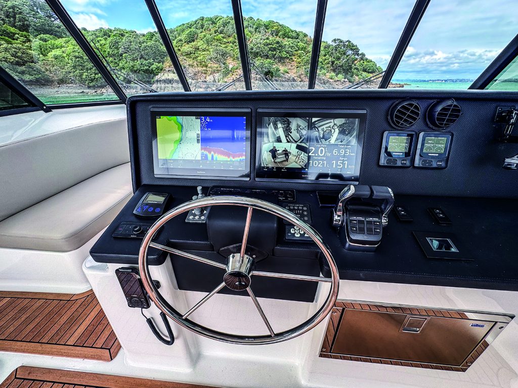 planned to monitor the anchor. Twin Garmin MFDs can be configured to display camera feeds, radar, navigation data, sounder (1kW transducer) and engine data, also shown on the dedicated digital Yanmar displays. The black vinyl-covered helm console is large enough to seat two behind in comfortable, swivelling gas pedestal helm seats. The autopilot and VHF are also by Garmin.