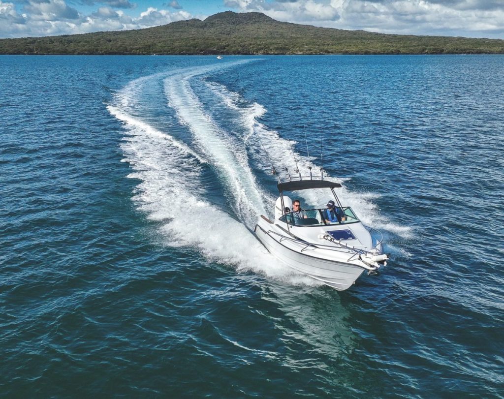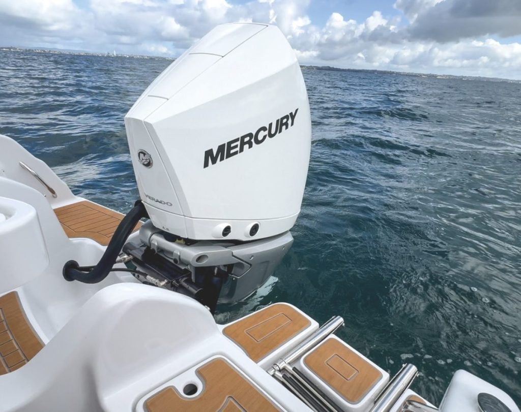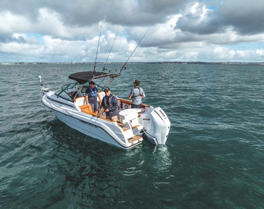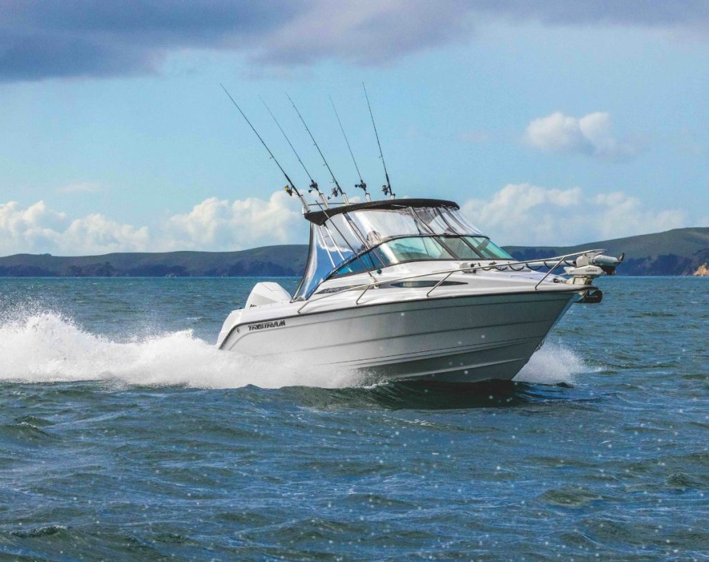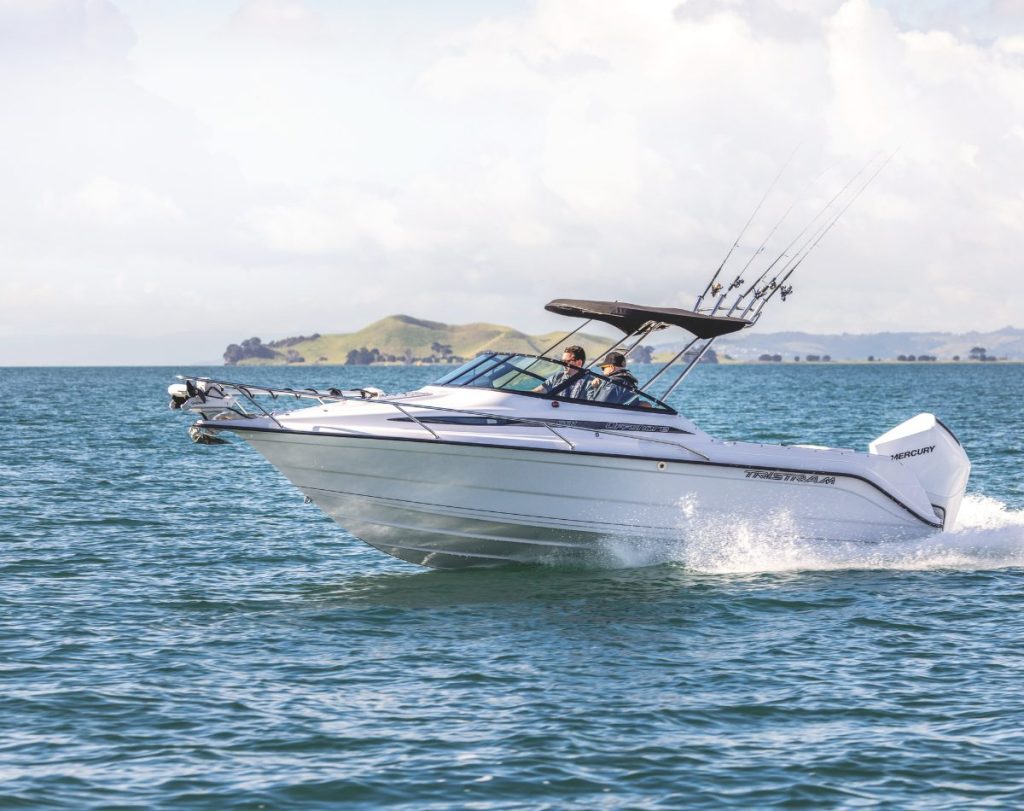 When Kingsley and Lance Fink pulled up at Westhaven boat ramp with the Tristram 691 Offshore in tow, it was easy to appreciate the appeal of this new model with its all-white gelcoat, new Tristram graphics, and white Mercury Verado 250hp outboard with custom matte-black lettering chosen to match the boat’s Mannix-black powder-coated windscreen surround