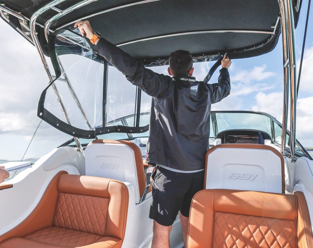The 691 Offshore features a canvas Targa top with wrap-around clears, including a rear drop-cover to fully enclose the ‘wheelhouse’ area. Clears – front, side and rear panels are manufactured in-house at Tristram Marine and proved easy to put up and take down. The canvas top is supported by a folding stainless-steel frame which also sports the six-rod rocket launcher. The Targa top folds down into the cockpit for trailering and garaging and a road cover is standard equipment.