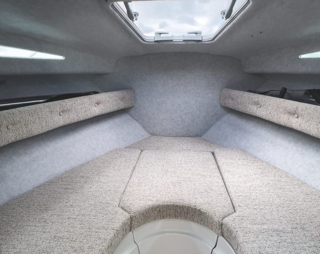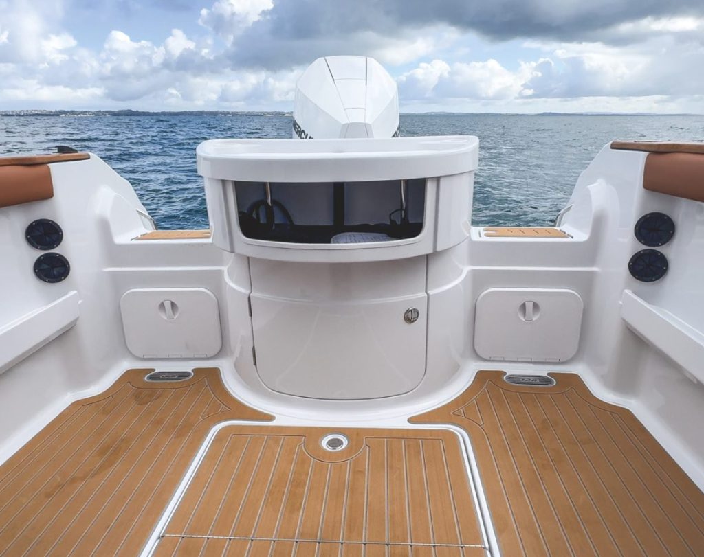 The cockpit layout has been reworked with a completely new transom arrangement, including step-throughs with plumbed and aerated live-wells on both sides, a new moulded bait station with a removable cutting board, generous glovebox compartment/shelf, stainless-steel rod holders.