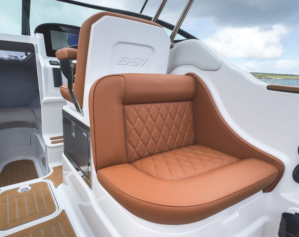 Seating is where the 691 really benefits from the legacy of its larger siblings, inheriting its seating arrangement from the Tristram 701 and 741. That means the 691 can offer galley facilities for the first time – Timeless is fitted with a fridge under the helm seat and the front passenger bucket seat hinges forward to reveal a flat worktop or food preparation area.