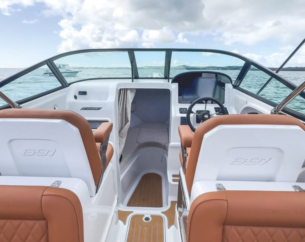 The new model offers the same high level of craftsmanship and quality Tristram owners have come to expect but adds a host of features previously available only on Tristram’s larger models. Its redesigned cockpit makes it better suited to fishing and diving and the styling inside and out feel fresh and modern, while the heater and wraparound clears invite year-round boating without the expense, extra weight and storage issues of a hardtop.