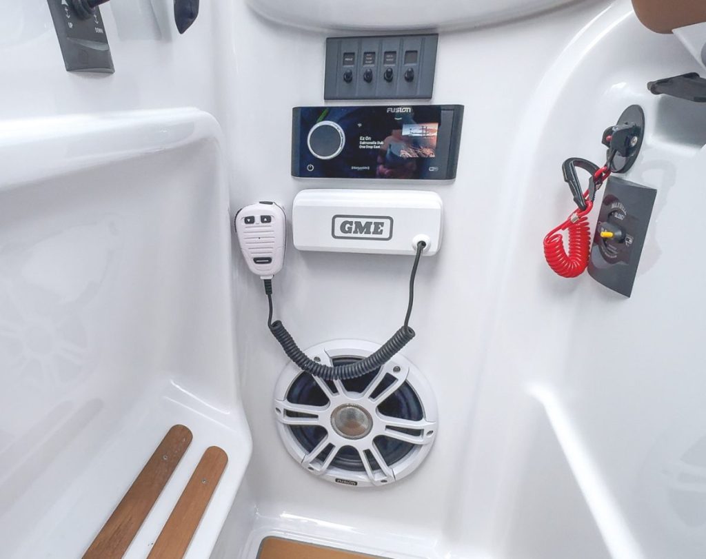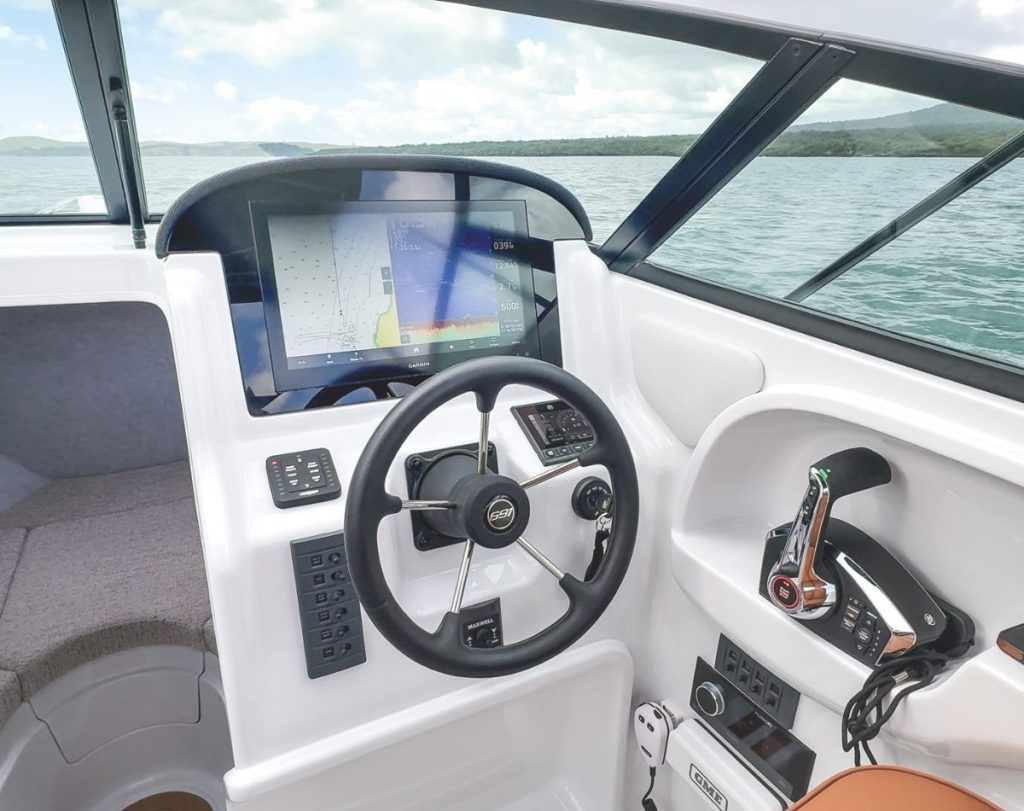 Controls for the recessed, concealed Maxwell capstan and the Lectrotab trim tabs also find space on the dash, alongside the compact Mercury multi-function display. There is also USB A +C charging with voltmeter and 12VDC power outlets on the helm and passenger sides. Digital switching is an option.