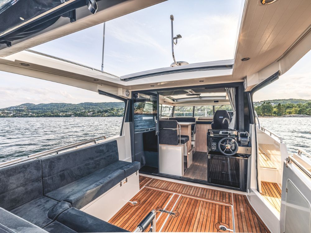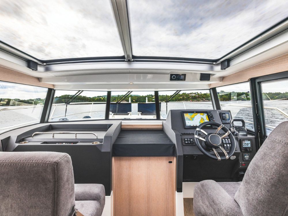 The Viknes 10 helm station is substantially raised. That’s a great help in terms of headroom at the entry point to the transverse guest cabin but it’s also a big help for the skipper. It enables you to stand up with your head through the sunroof to such a degree that it’s no problem looking down at the bow of your own boat. The Viknes helm also comes with a port window, a skipper’s side door, a well-placed joystick and lots of coolness and glare protection from the overhanging roof structure of that reverse screen, so it’s a very natural and confidence-inspiring position – and the performance fully supports that.