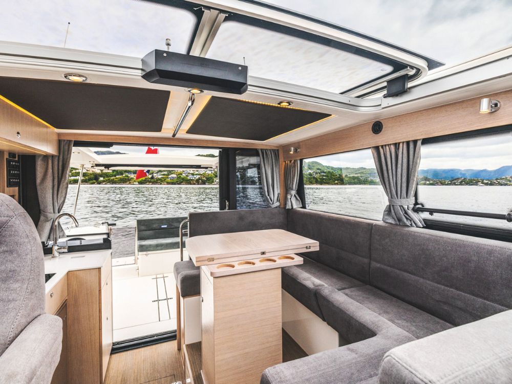 When you head from the aft cockpit into the sheltered saloon, the single-level deck, three-part sliding doors, and drop-down starboard window integrate the two zones to excellent effect. The shape of the two seating zones doesn’t quite collaborate in that, but even so, it doesn’t take long before the details again bring a smile to your face. The raised port dinette has great all-round views, a swing-over forward backrest for a pair of co-pilots, and a central support for its oak table that takes the form of a very neat cabinet with storage for all your cups and glasses. You can’t convert it into an occasional double with this arrangement, but again, you can opt for the more conventional telescopic leg if you want to use it as an occasional double berth.
