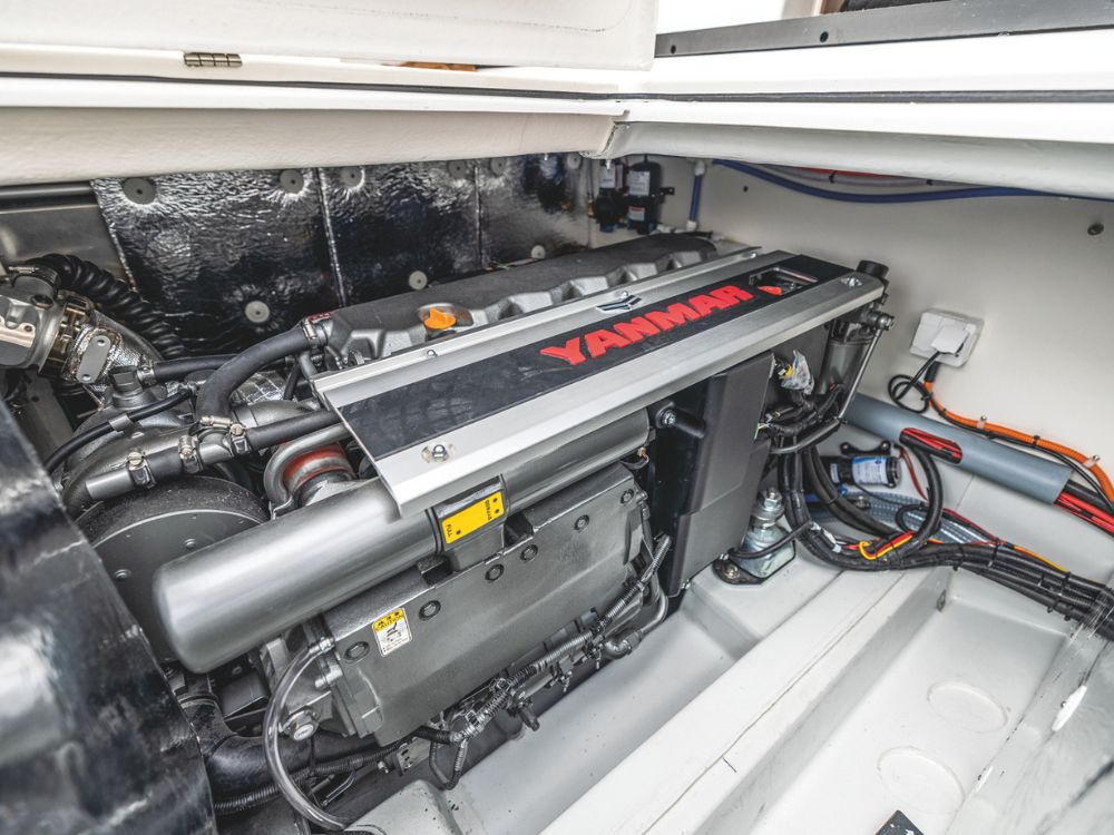 Across on the starboard side, an L-shaped galley features a clever little stove with gas beneath glass, as well as a twin sink that sees you facing aft into the cockpit. There’s a decent bit of work surface here too plus a lifting TV behind the hinged helm seat so you can view it from that port dinette. It’s all perfectly effective, but oddly enough, it’s the storage here that feels particularly impressive. In addition to the various drawers and cupboards, there’s a big transverse storage cavity beneath the saloon’s aft deck, all beautifully divided into boxes, drawers, and cubbyholes. And better still, if you pop back out into the cockpit and lift the engine hatch, you discover that the engine itself is cordoned off with a false bulkhead, enabling you to use the spare volume for storage in a way you would never really consider on any other boat.