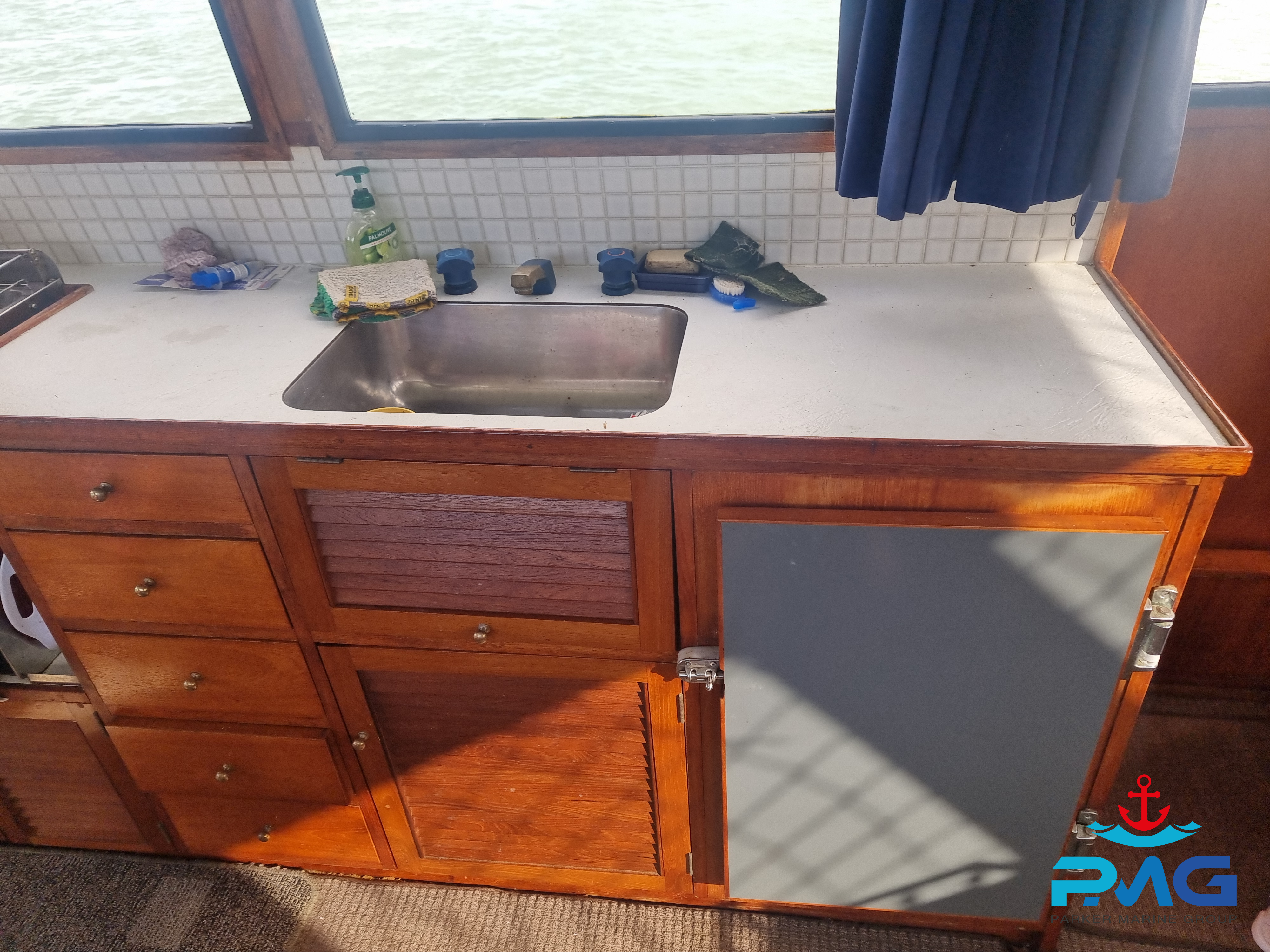 A separate shower stall, sink, and head with holding tank, and ample storage complete this area. A ladder from the cockpit provides access to the flybridge where there’s no shortage of space for lounging with seating next to the centrally located helm which offers fantastic visibility. The helm is well laid out and equipped, with all controls and switches in easy reach of the skipper.