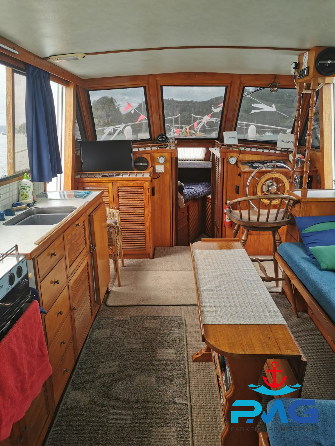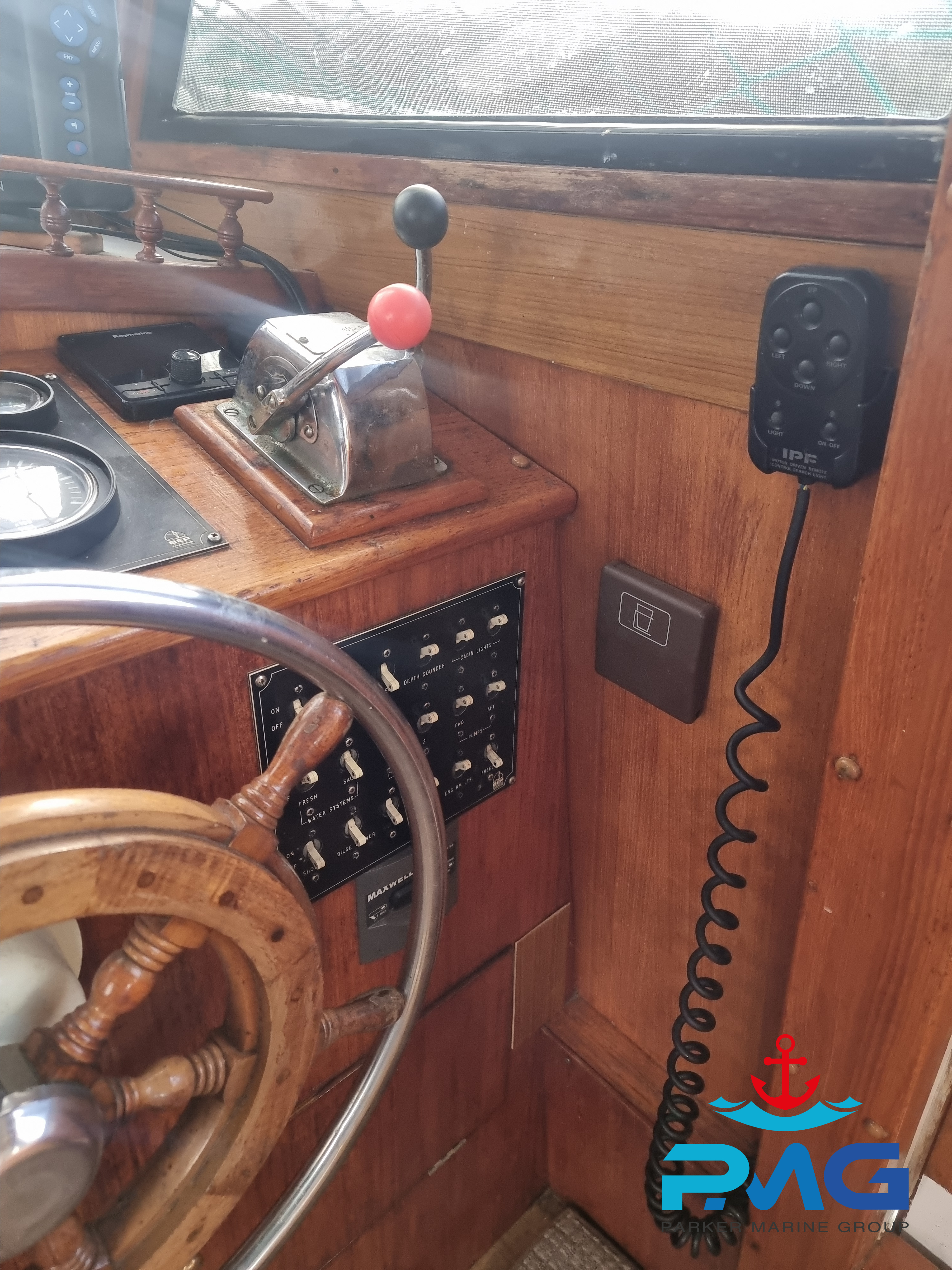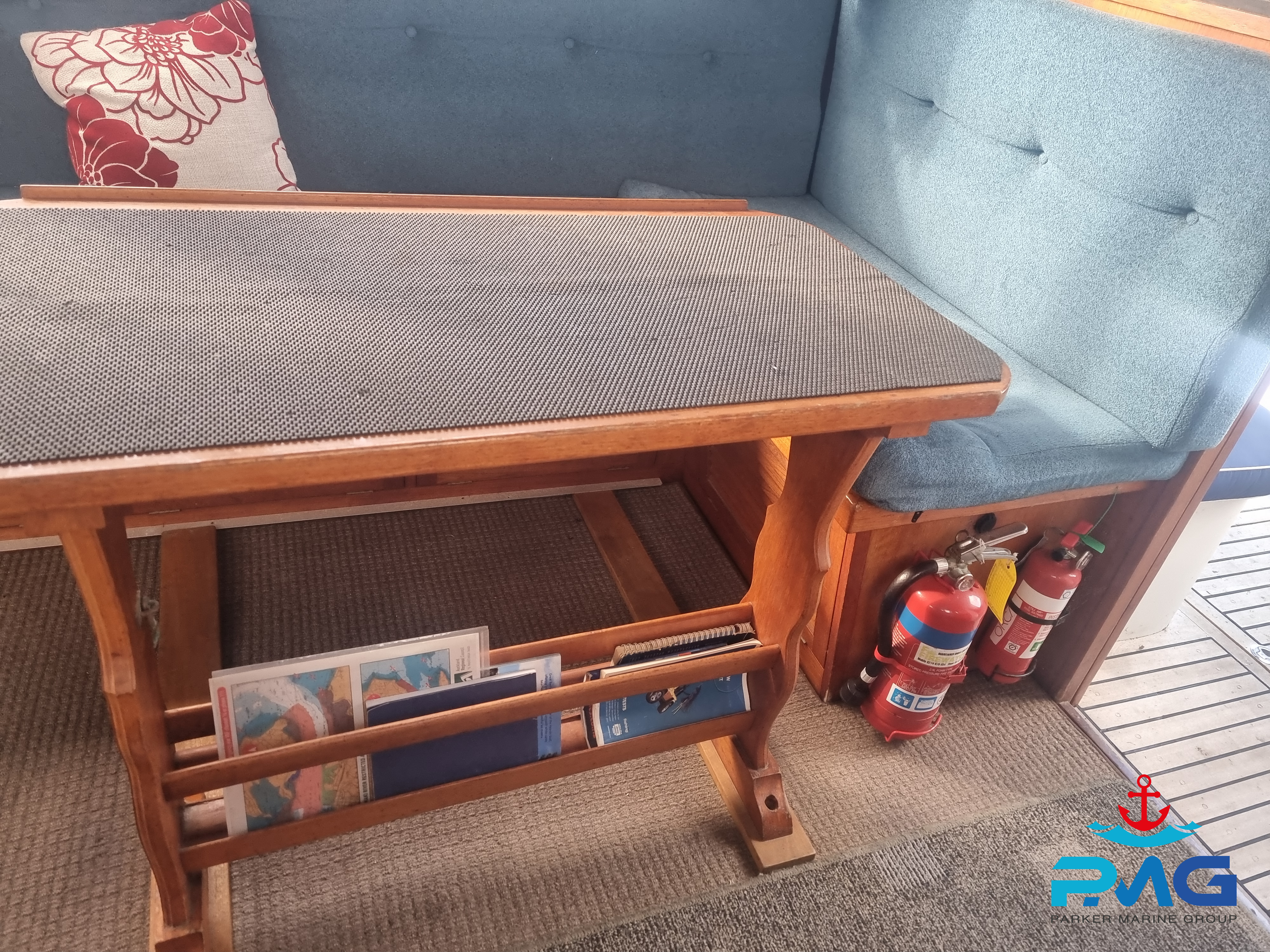 Powered by a very reliable and well maintained 120hp Ford on shaft, she cruises at 7.3 knots and a max speed of 8.5 knots. Twin helm stations with hydraulic steering. The open plan saloon features a large dining table.