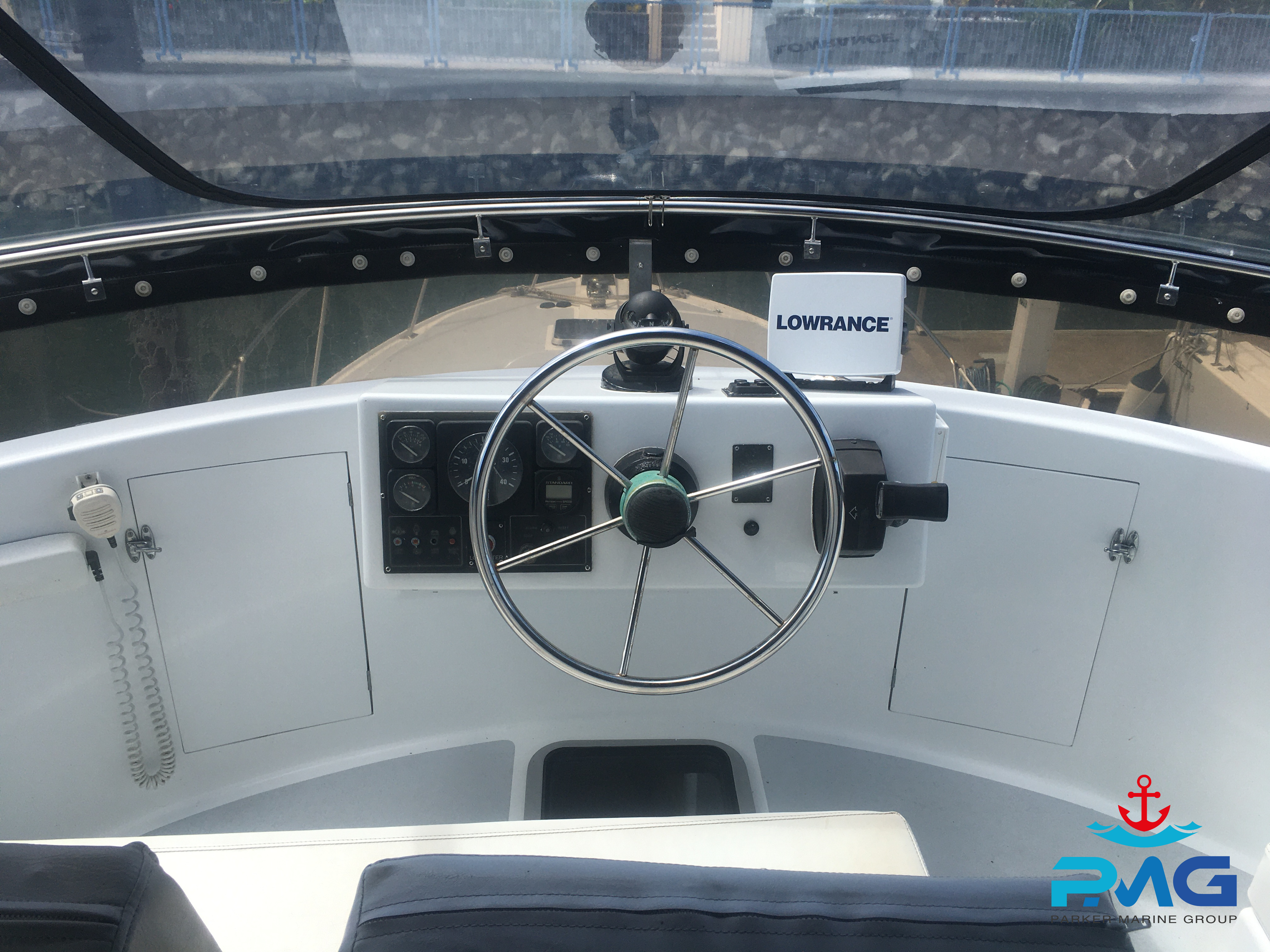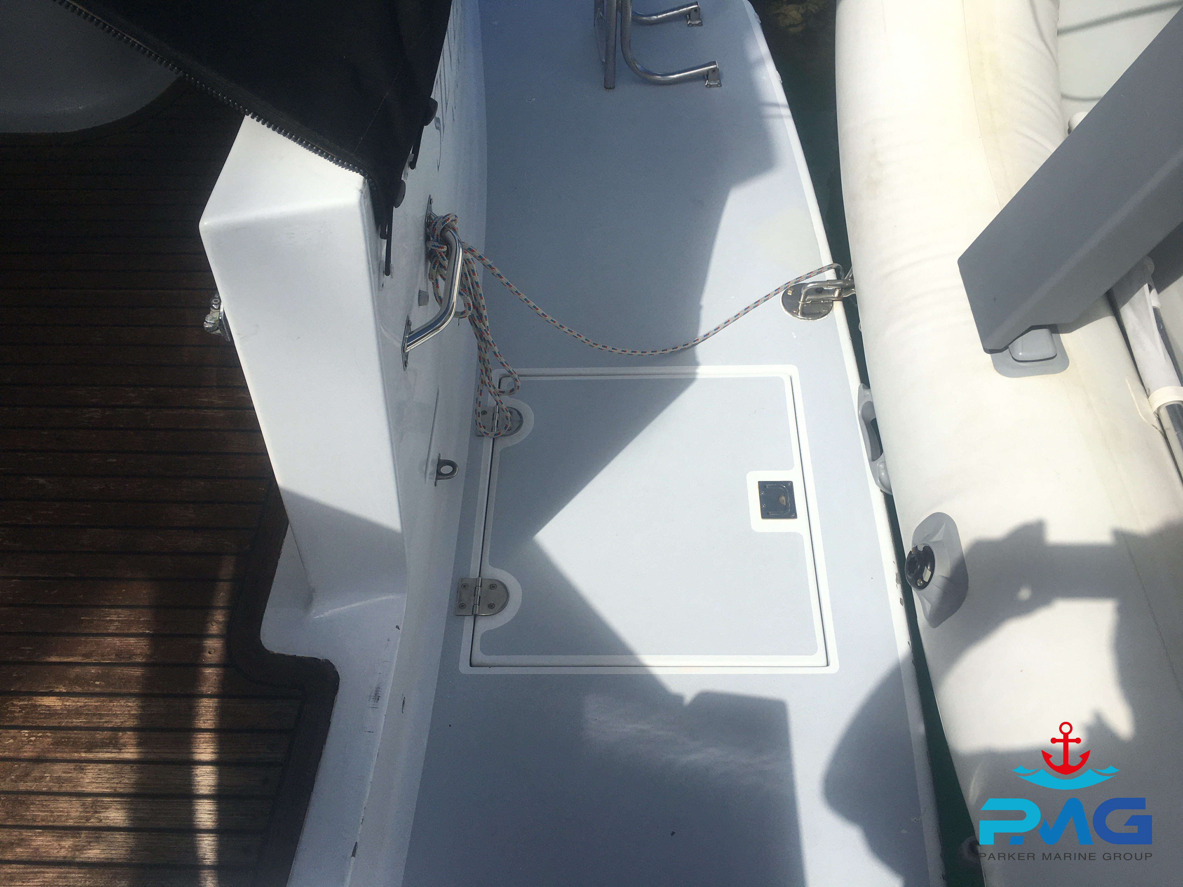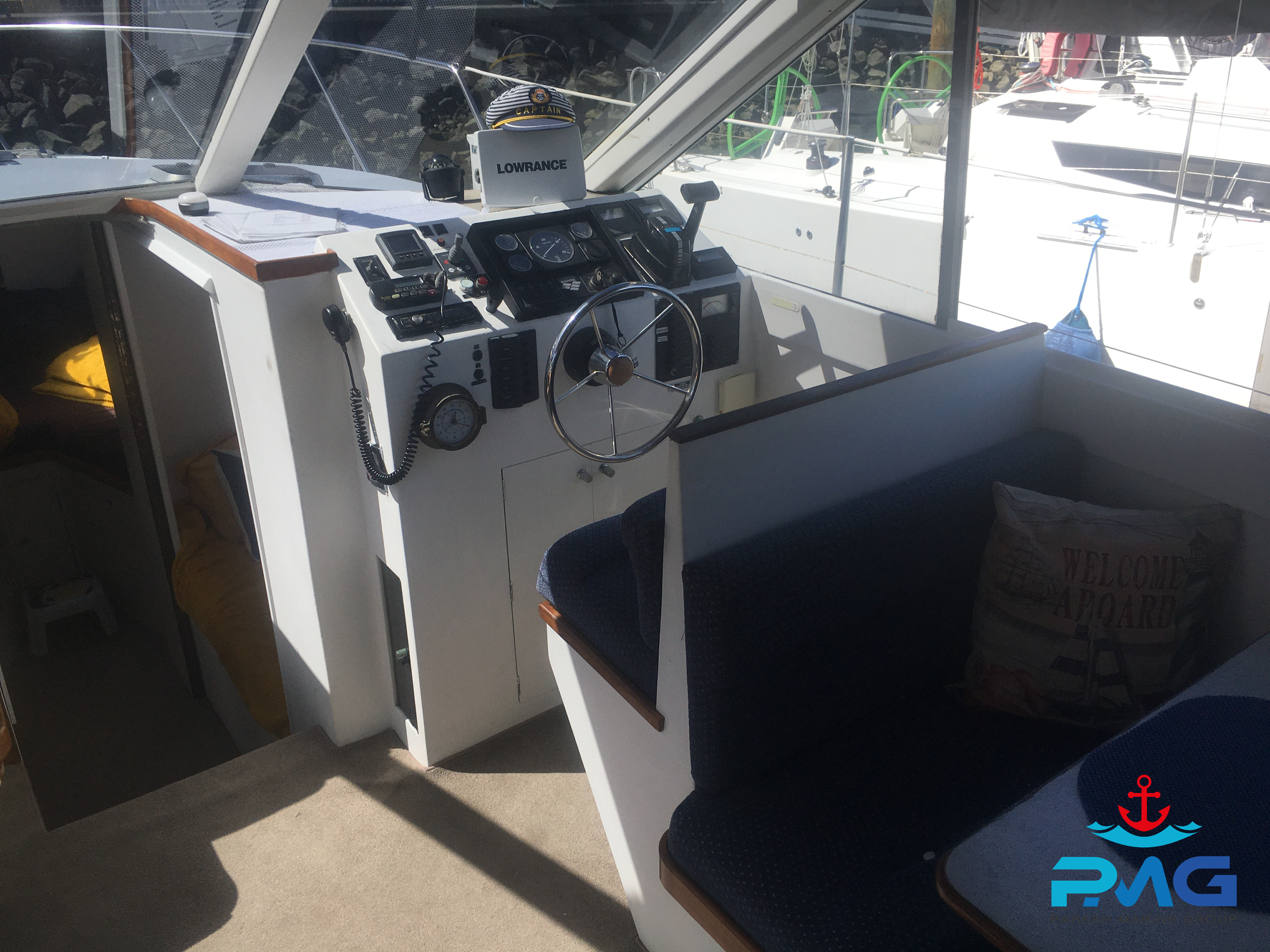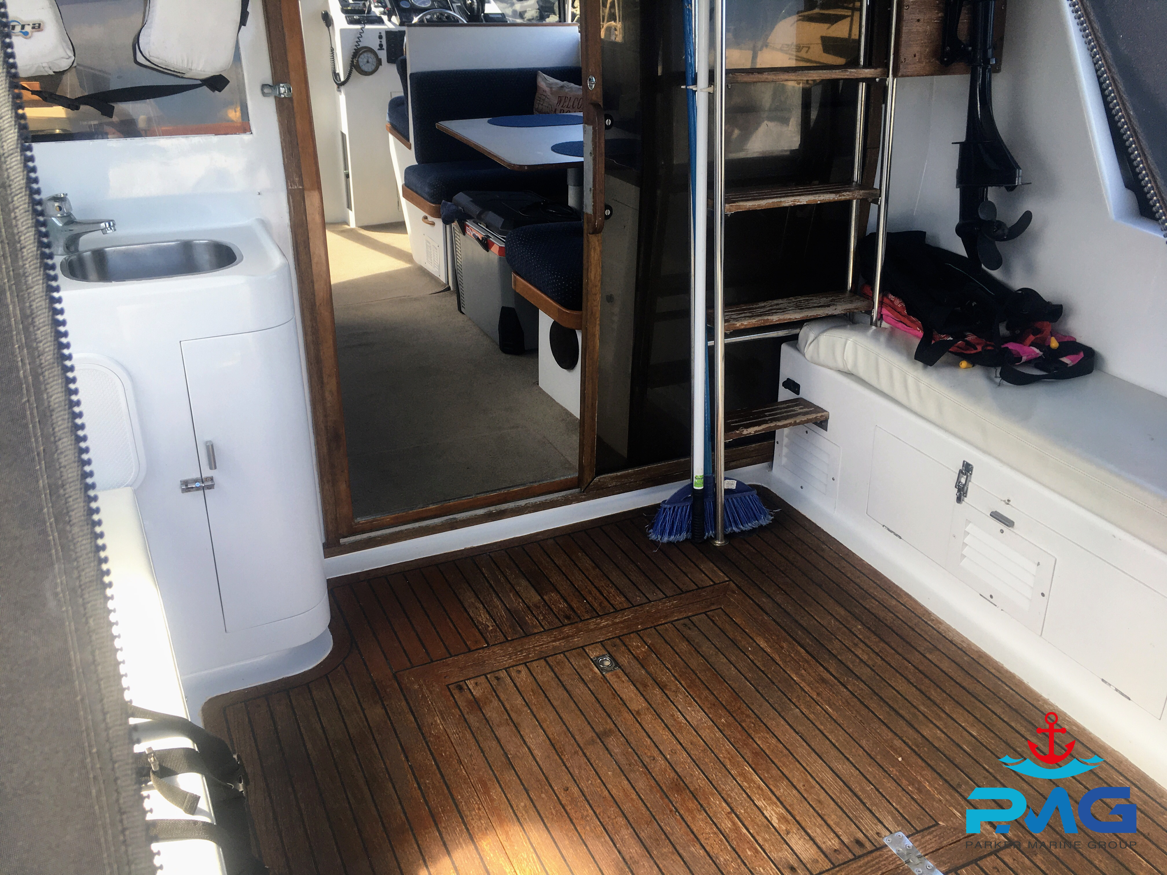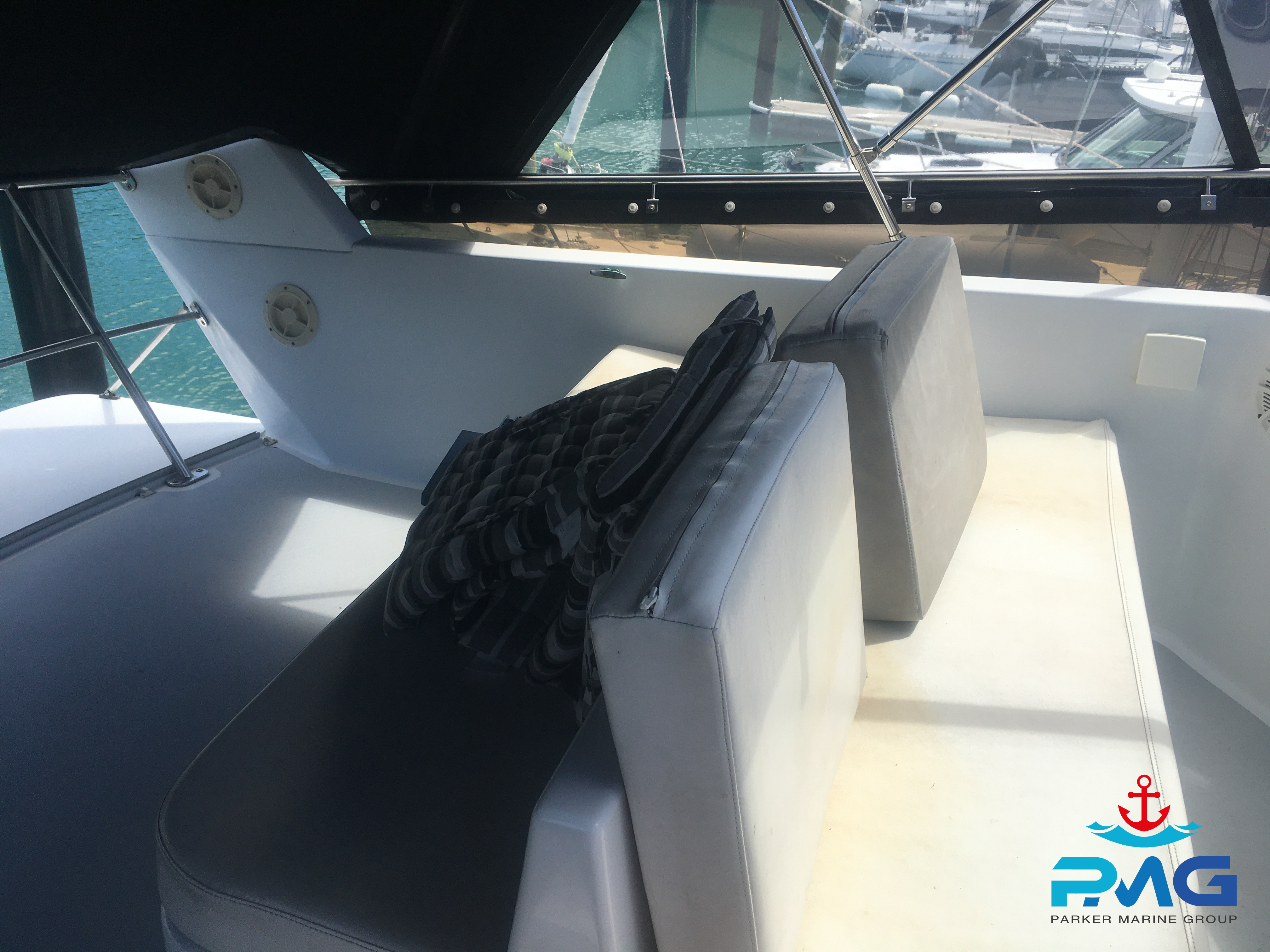 With the dinghy stowed on the foredeck, Silverfox should just fit into a 12m marina berth. The teak laid cockpit has a generous lazarette and ladder access to the fly bridge. Saltwater washdown,