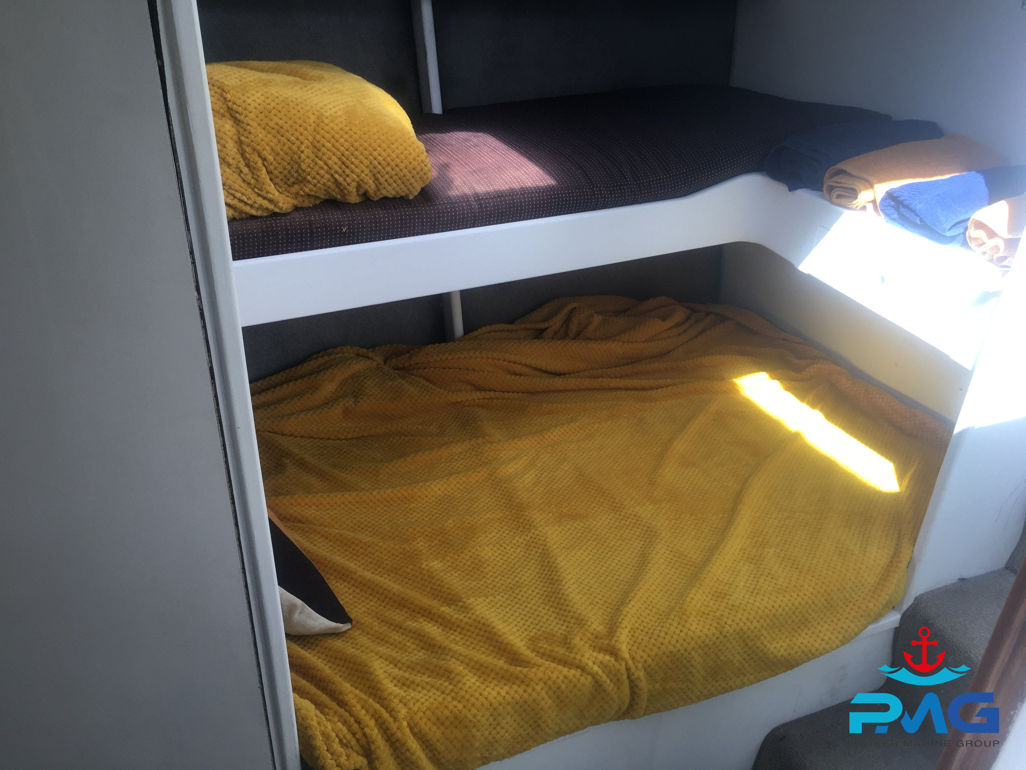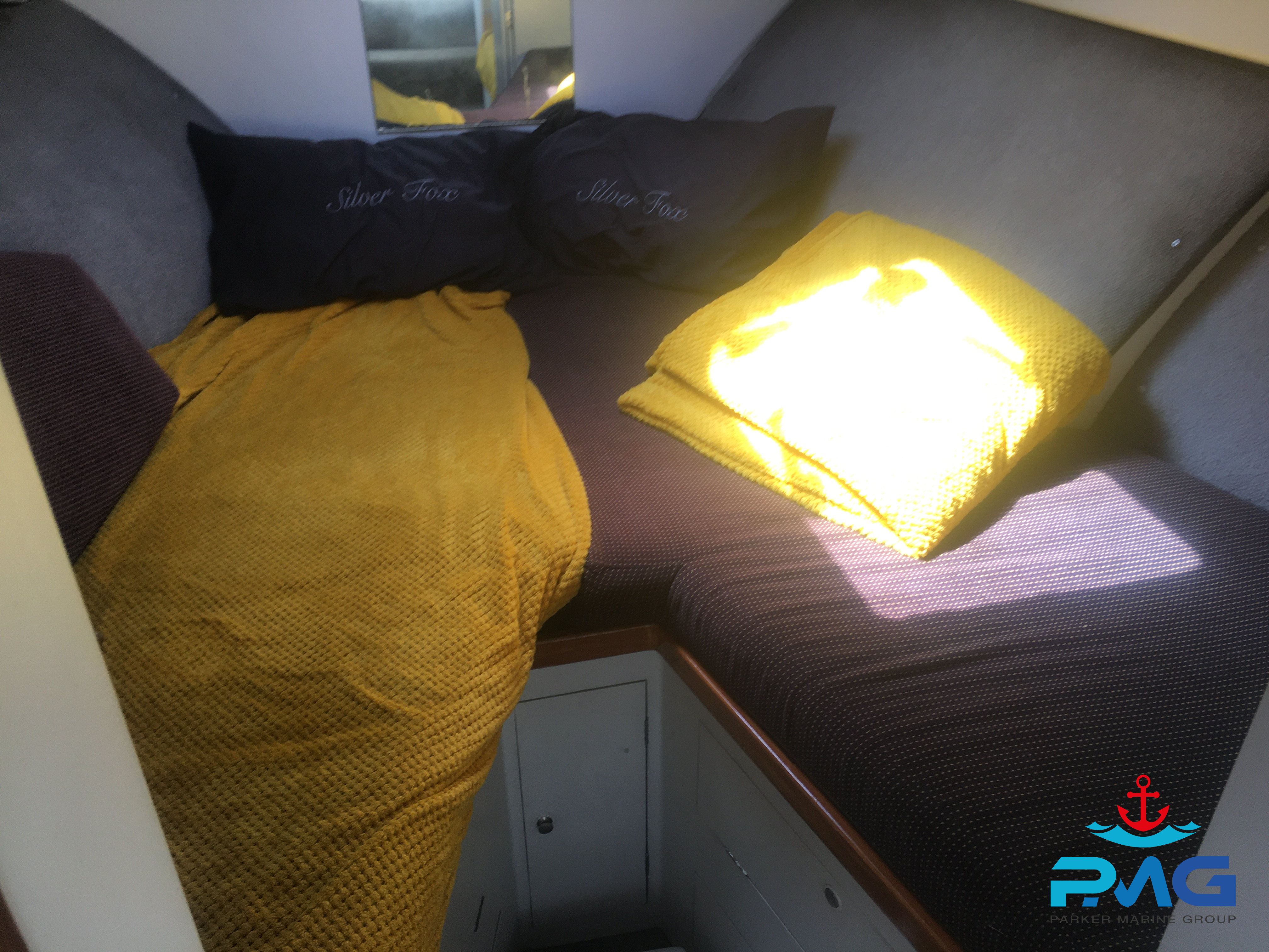 Forward, bathroom to port with head, vanity, and shower. Double berth cabin to Starboard with single bunk above. Vee berth cabin in forepeak.