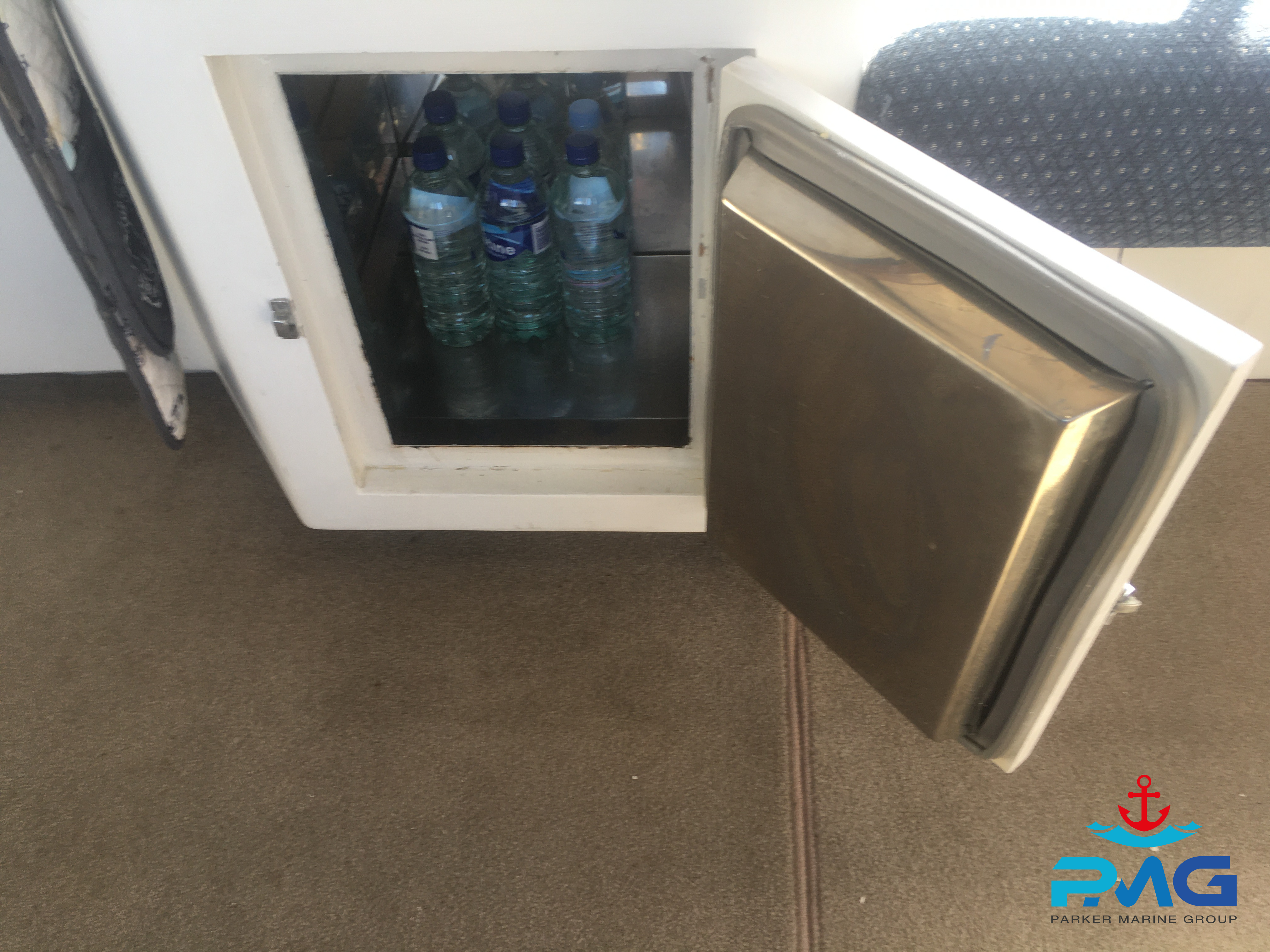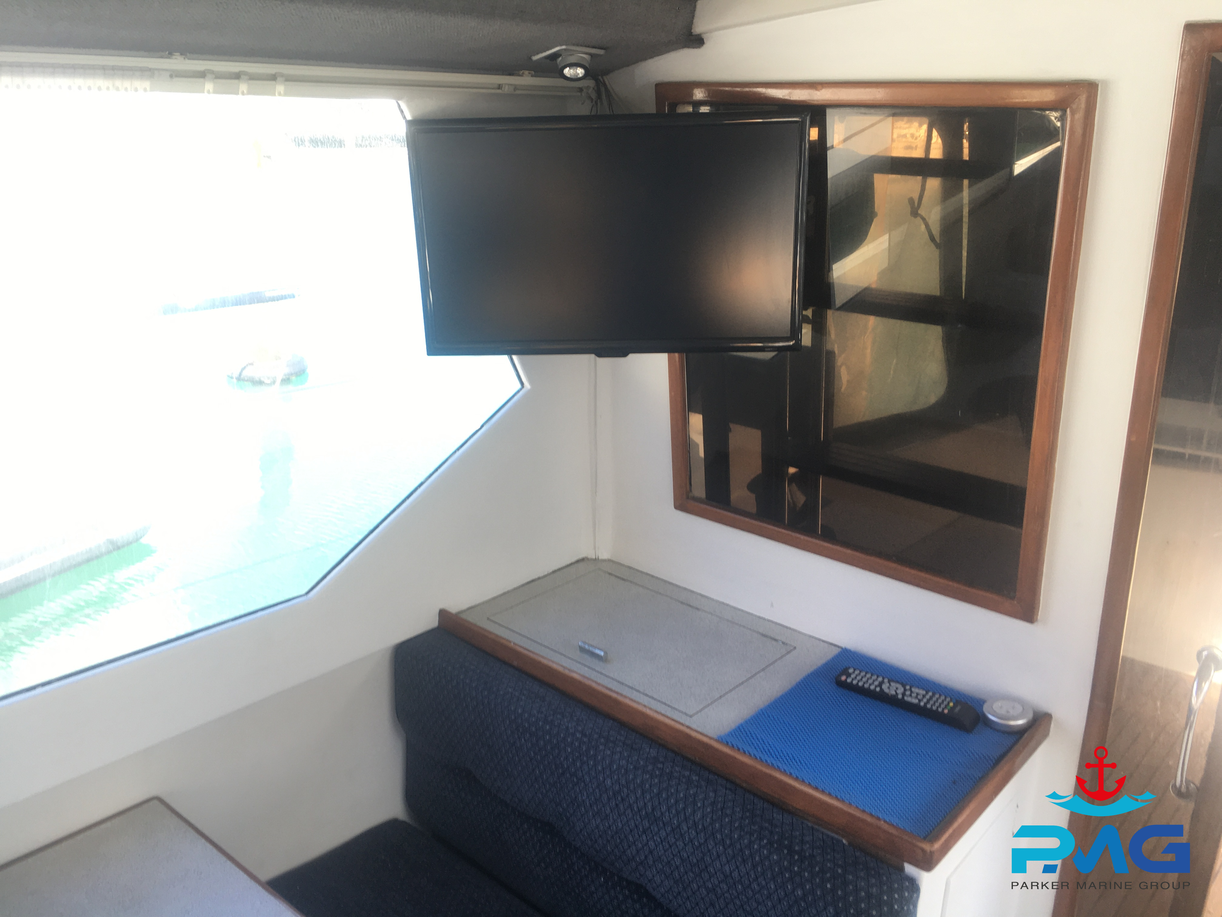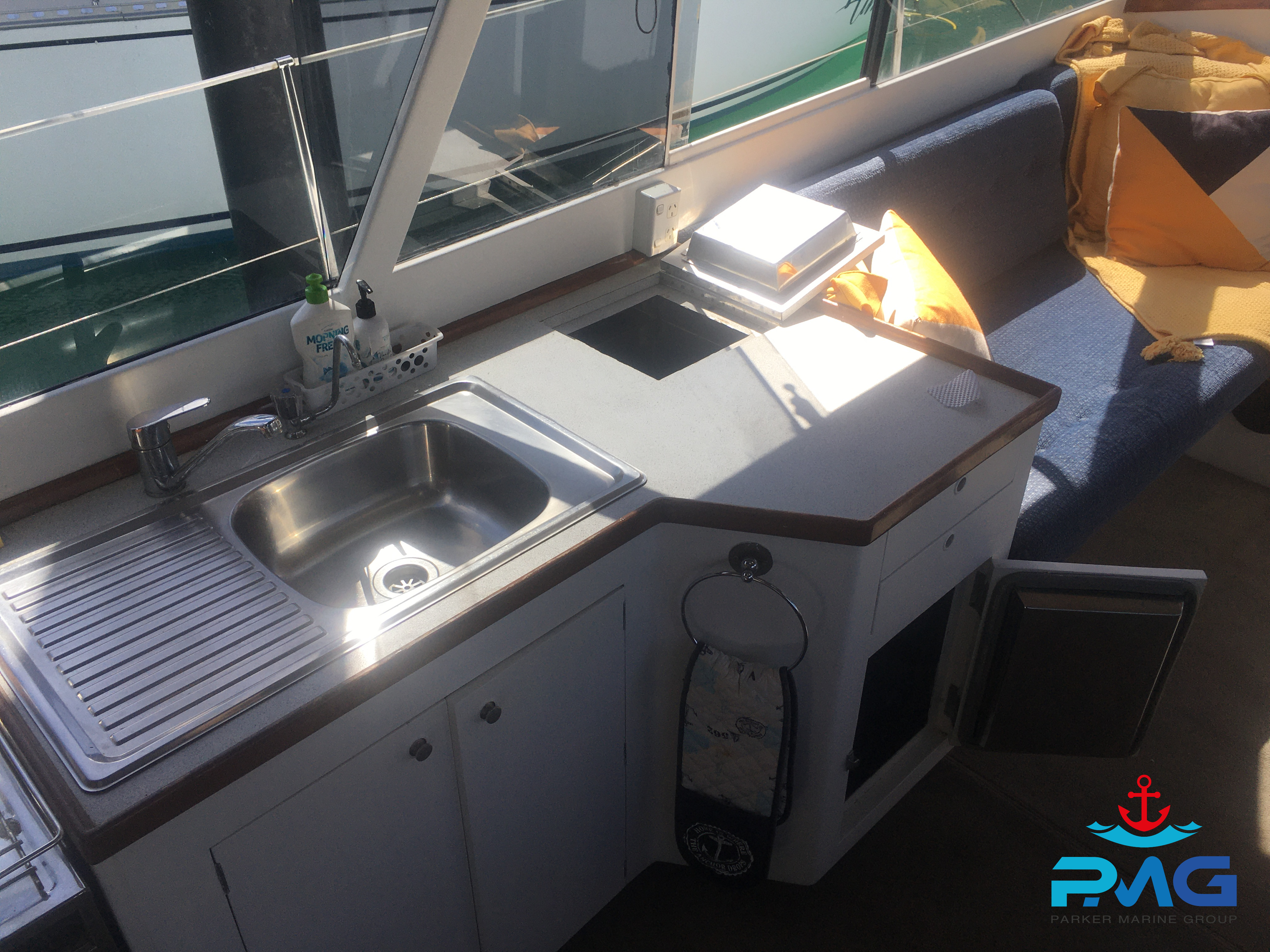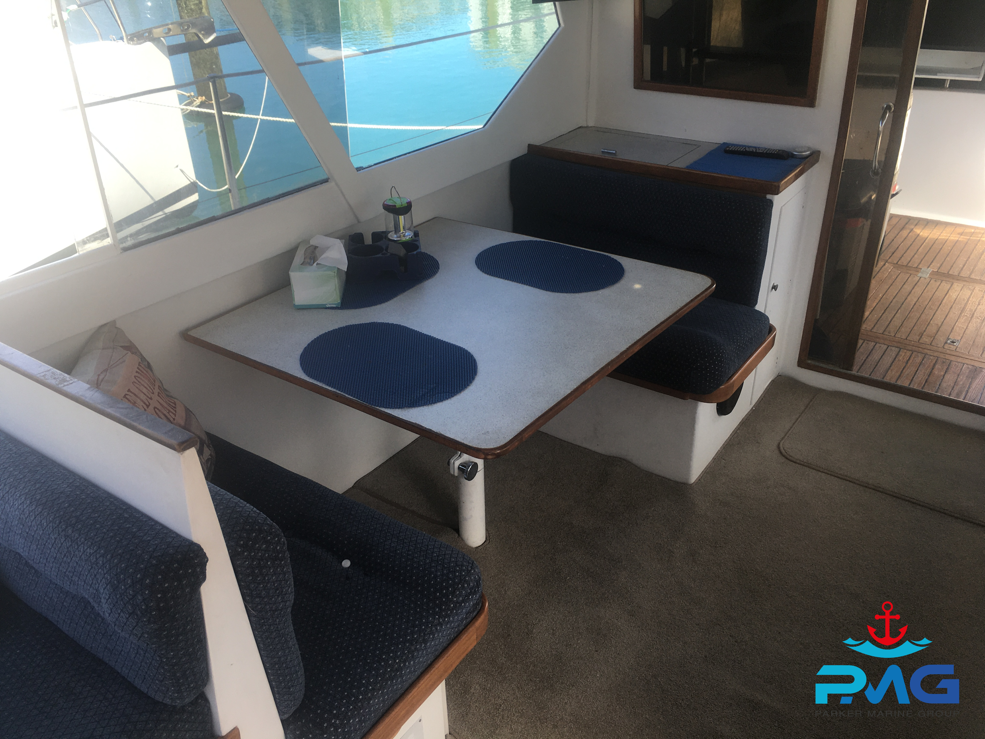 The saloon has an aft galley with a separate fridge and freezer. There is an additional large freezer under the convertible settee forward of the galley. Lower helm and dinette to starboard.
