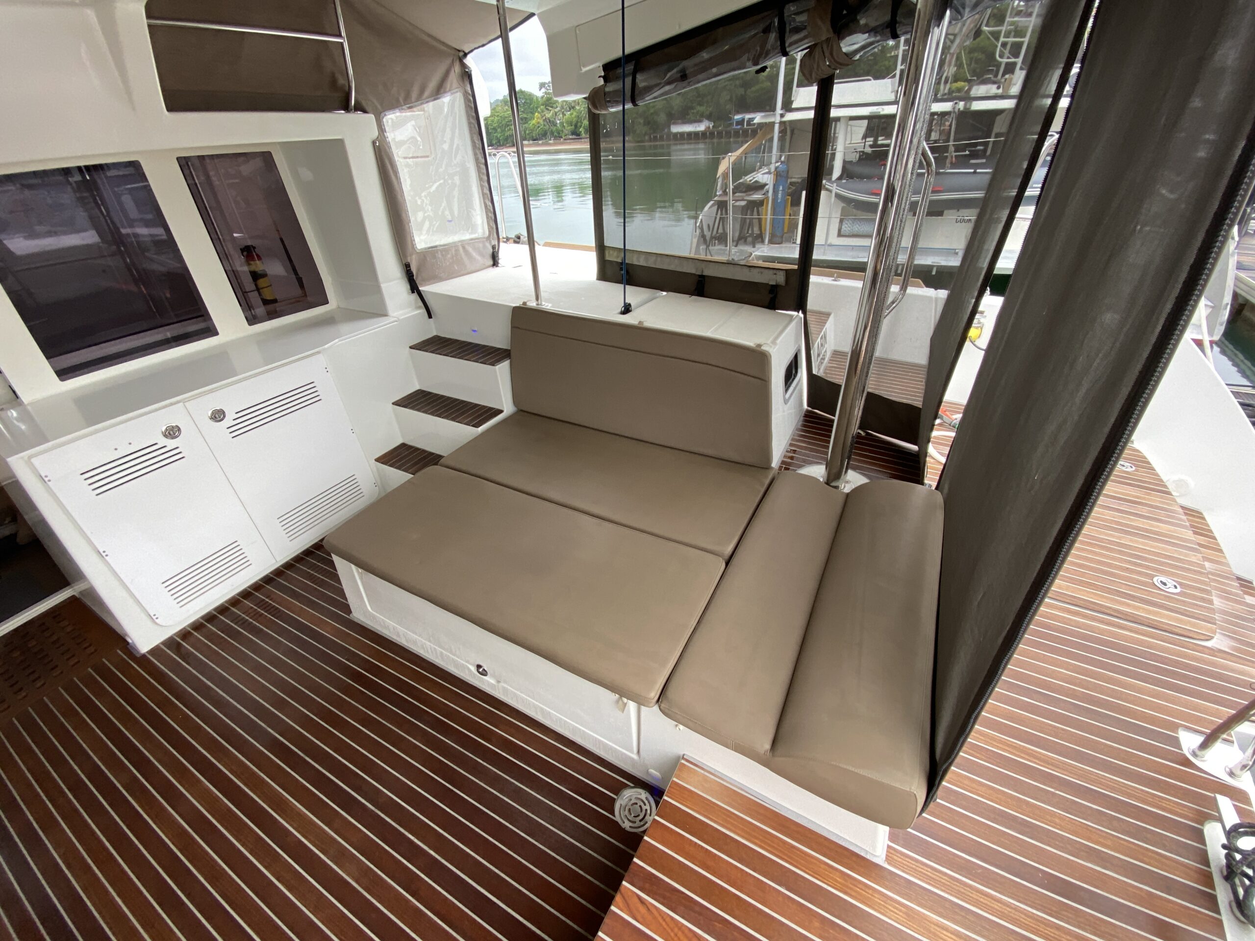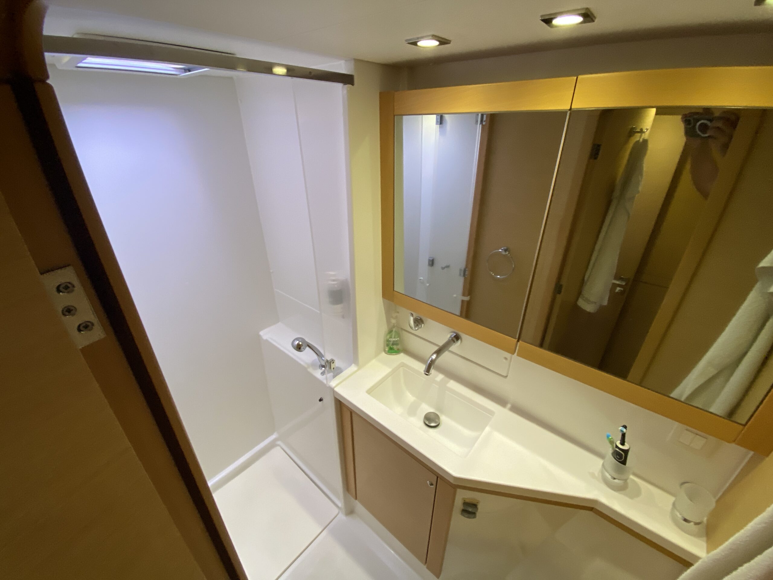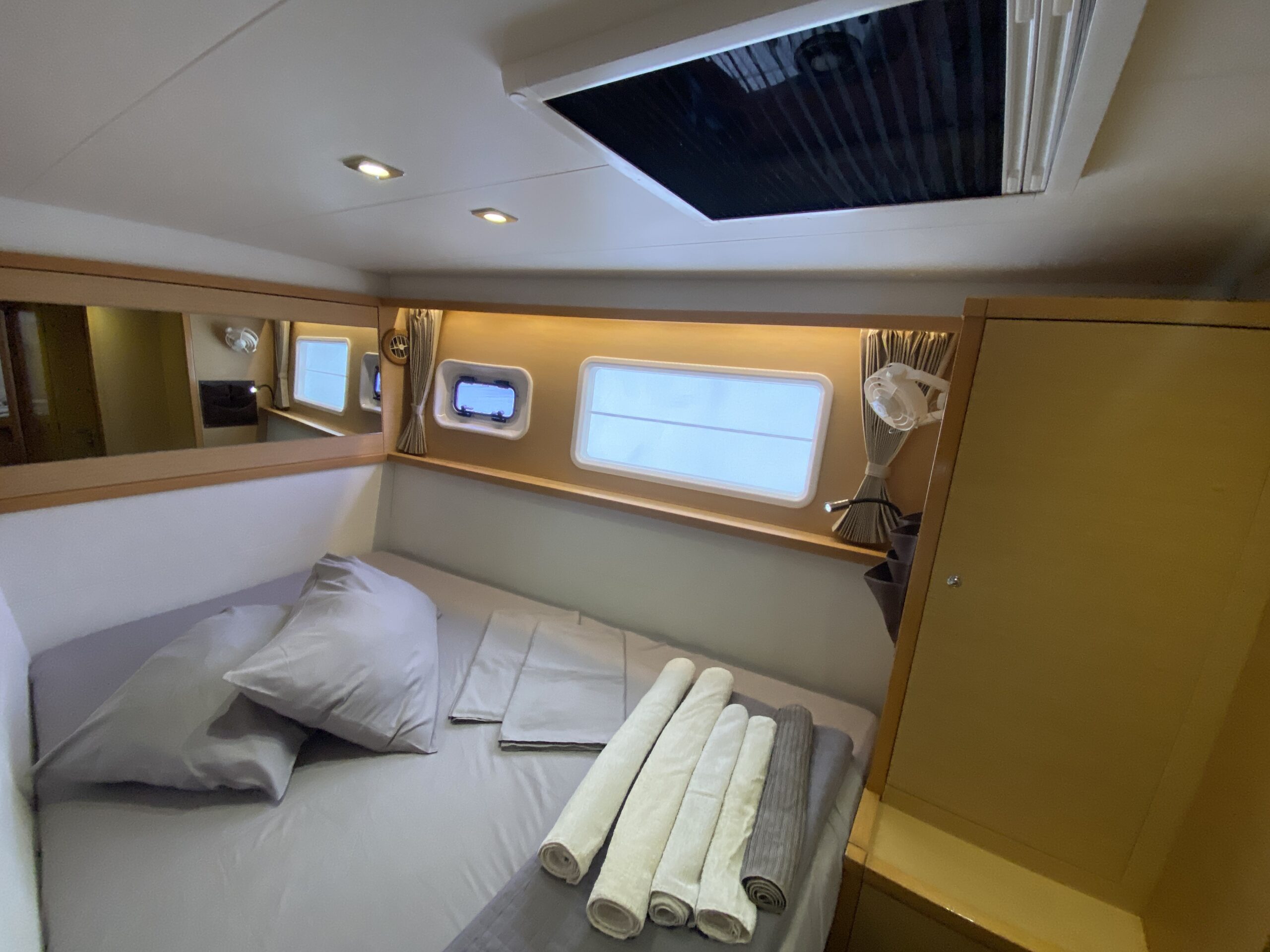 Custom Sunbrella covers protect every hatch while teak and GRP surfaces gleam. Inside, four bright ensuite cabins are air-conditioned by a powerful Webasto 55,000 BTU system, complemented by new mattresses with protectors. The saloon offers a light-filled galley-up layout, including two 130-litre fridges, a Vitrifrigo 65-litre portable freezer in the cockpit, three-burner gas stove, oven, microwave and a Candy 9kg washing machine (2021) for comfortable liveaboard life.