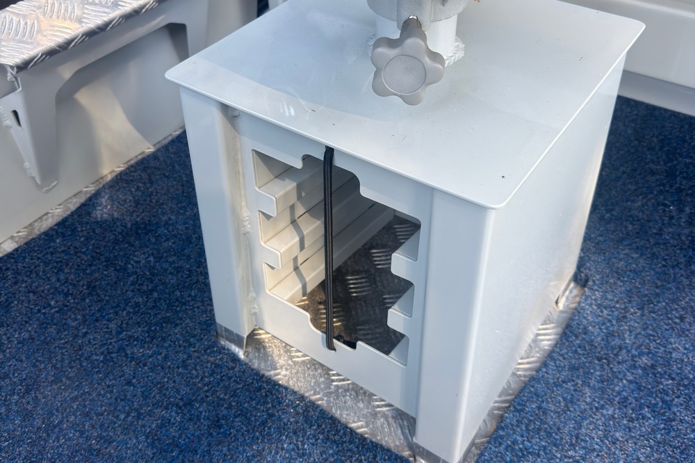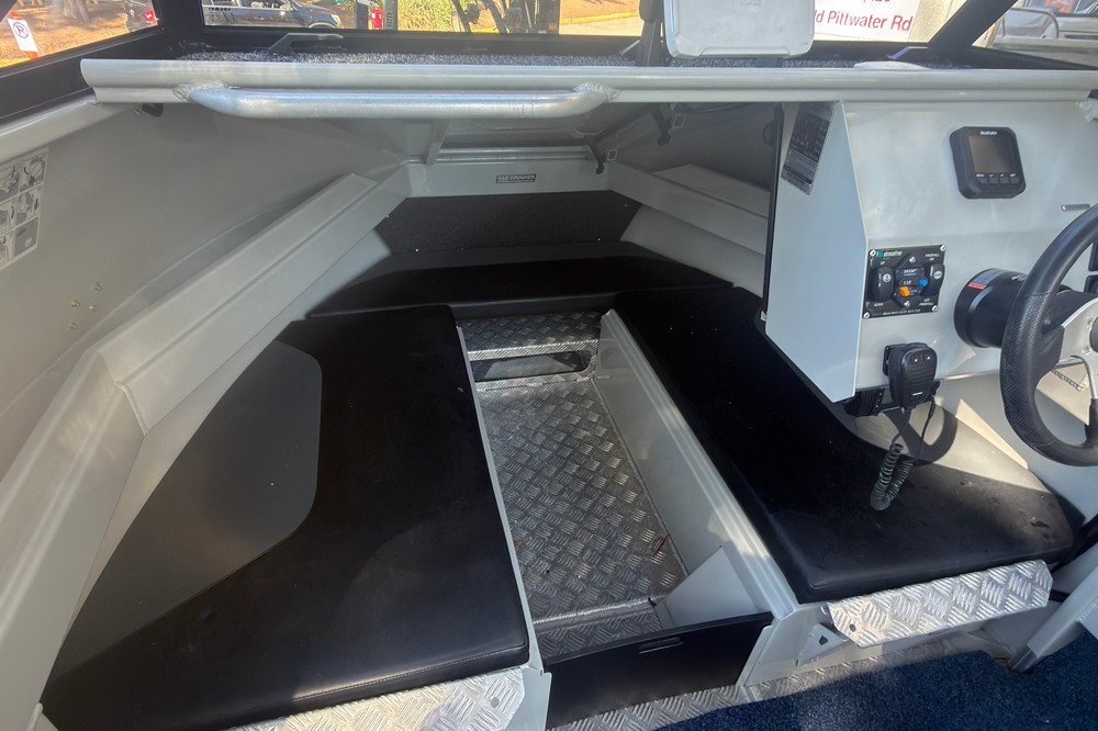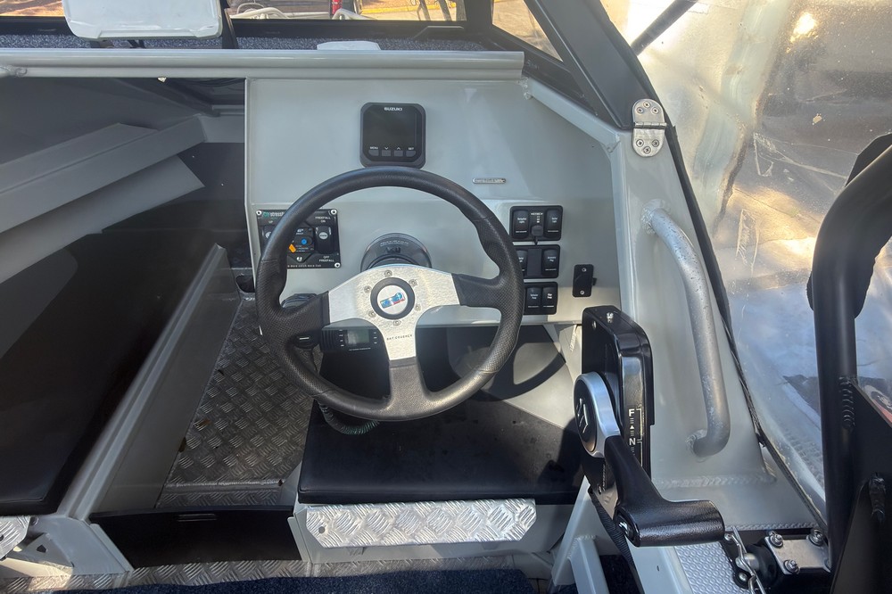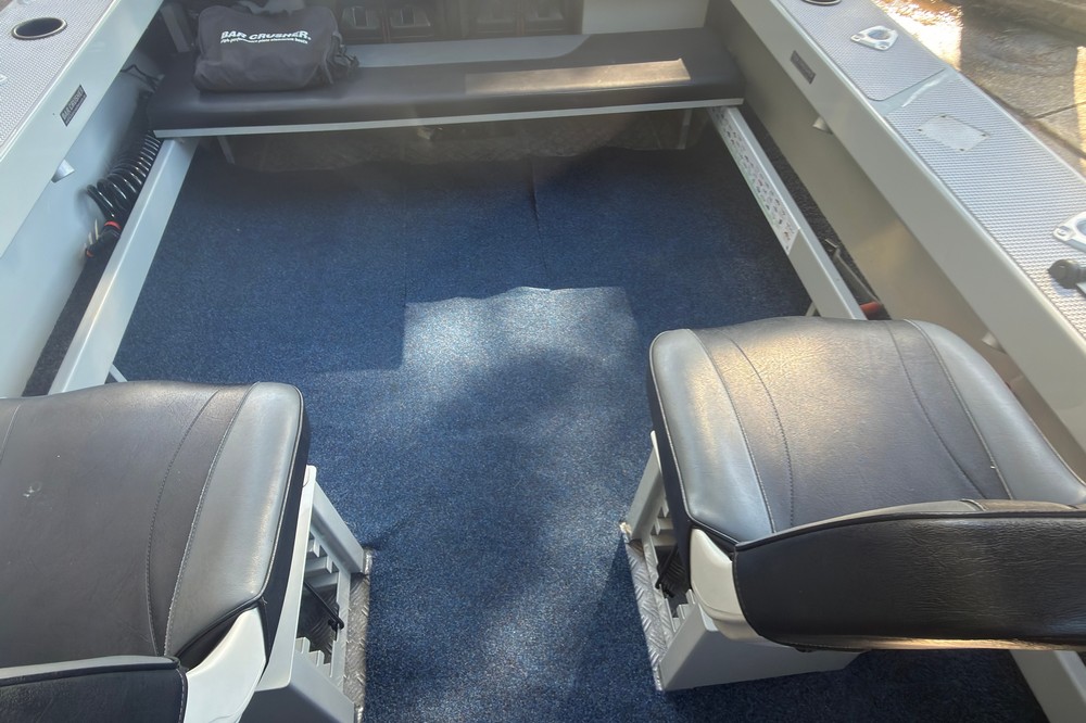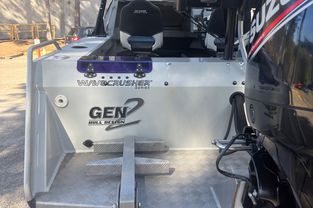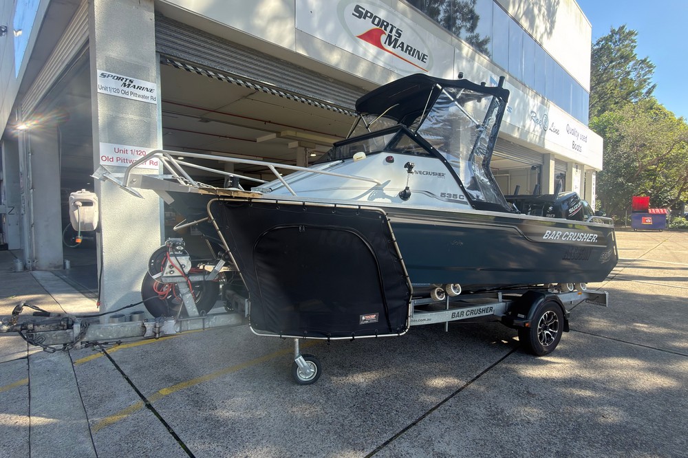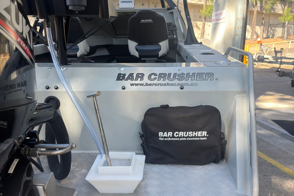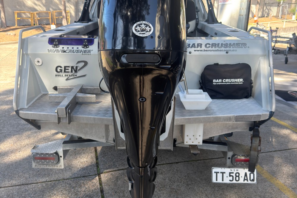The Bar Crusher 535C (Wavecrusher) is a 5.35m plate aluminium cuddy cabin boat designed for inshore/offshore fishing. Key specs include a 2.15m beam, 4mm bottom sheets, 115L fuel capacity, and 60-115hp rating, offering a ~1150kg dry tow weight with Quickflow water ballast for high stability at rest. Key Specifications (Bar Crusher 535C)