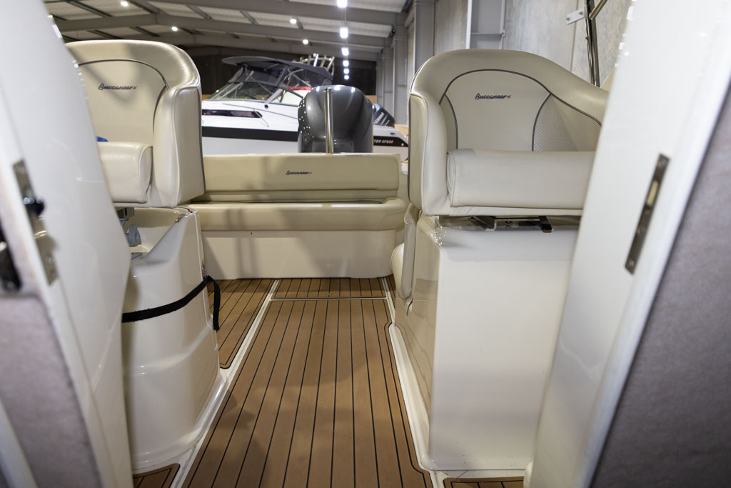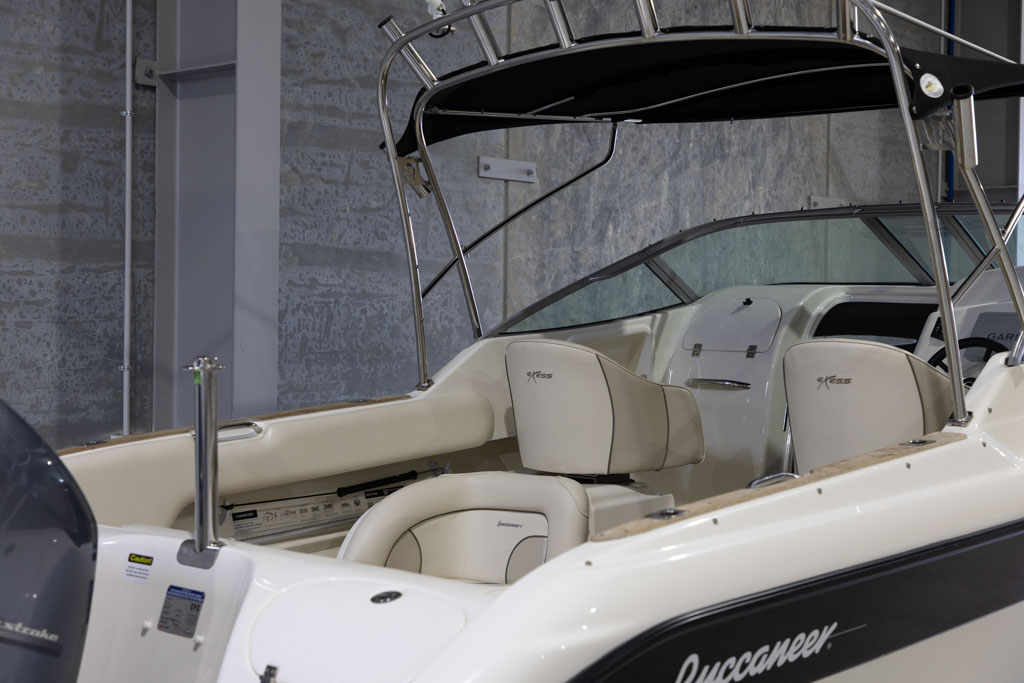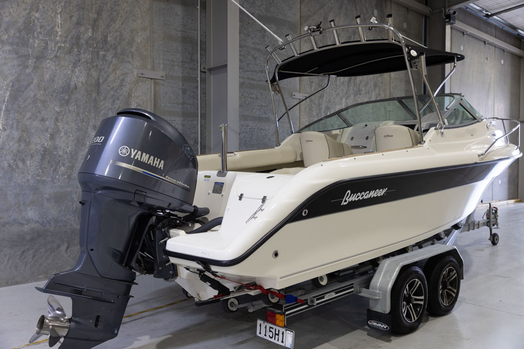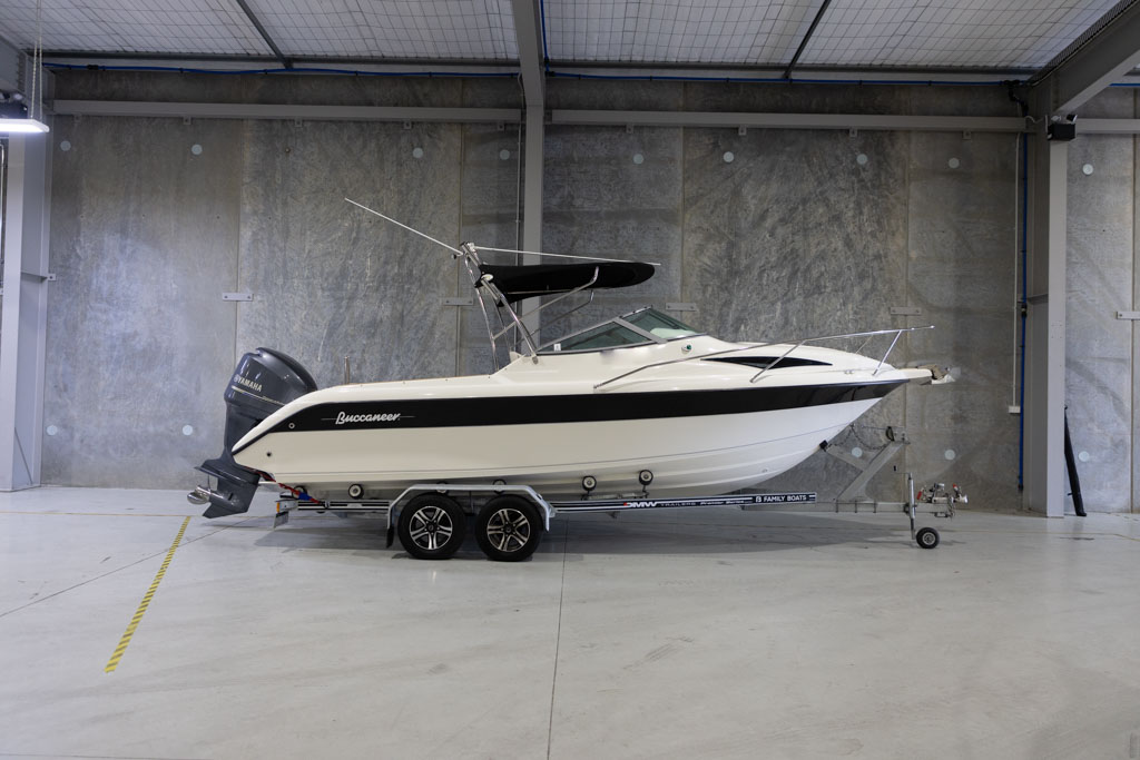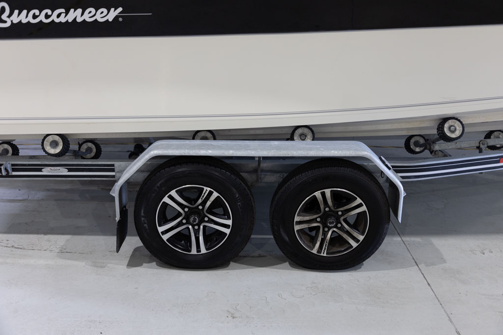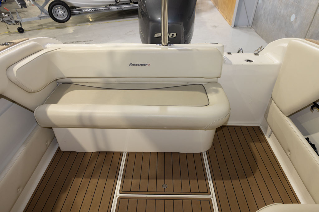 Yamaha’s four-stroke technology ensures quiet operation and dependable power whether you’re running offshore, cruising the lake, or towing skiers. The boat sits on a DMW tandem-axle braked trailer, providing excellent on-road stability and easy launching and retrieval. This Buccaneer is exceptionally well equipped, featuring hydraulic steering for effortless handling and precise control.
