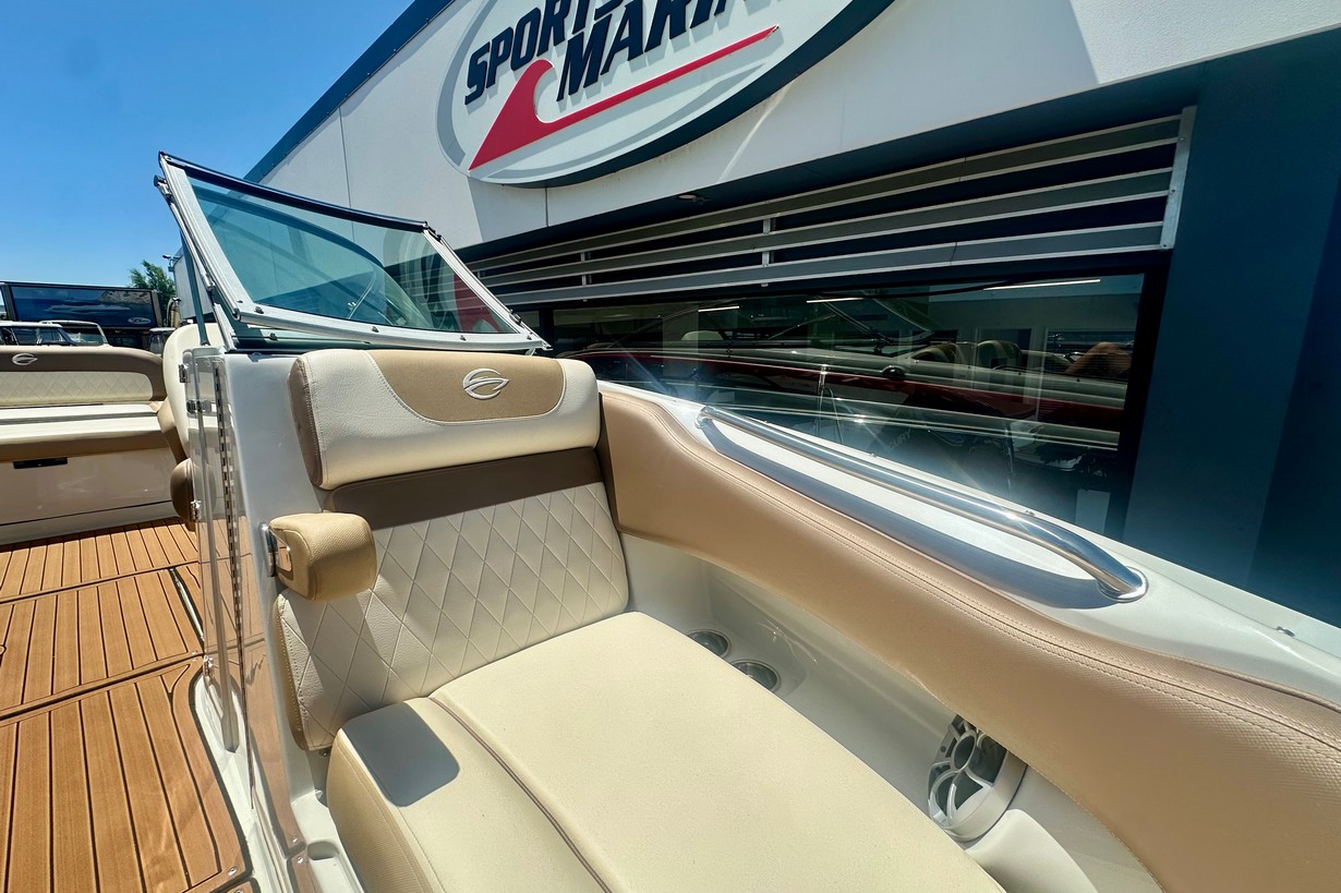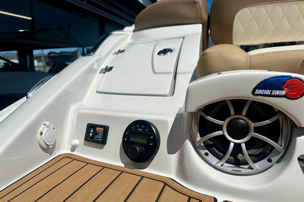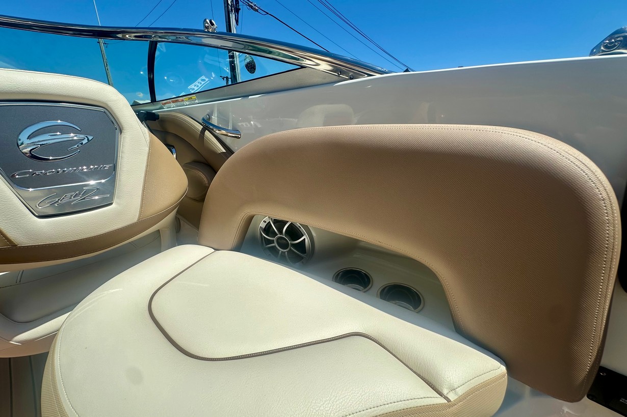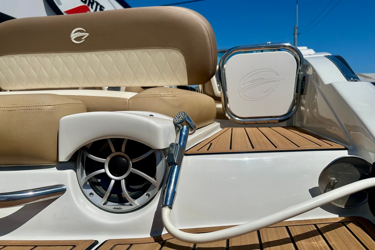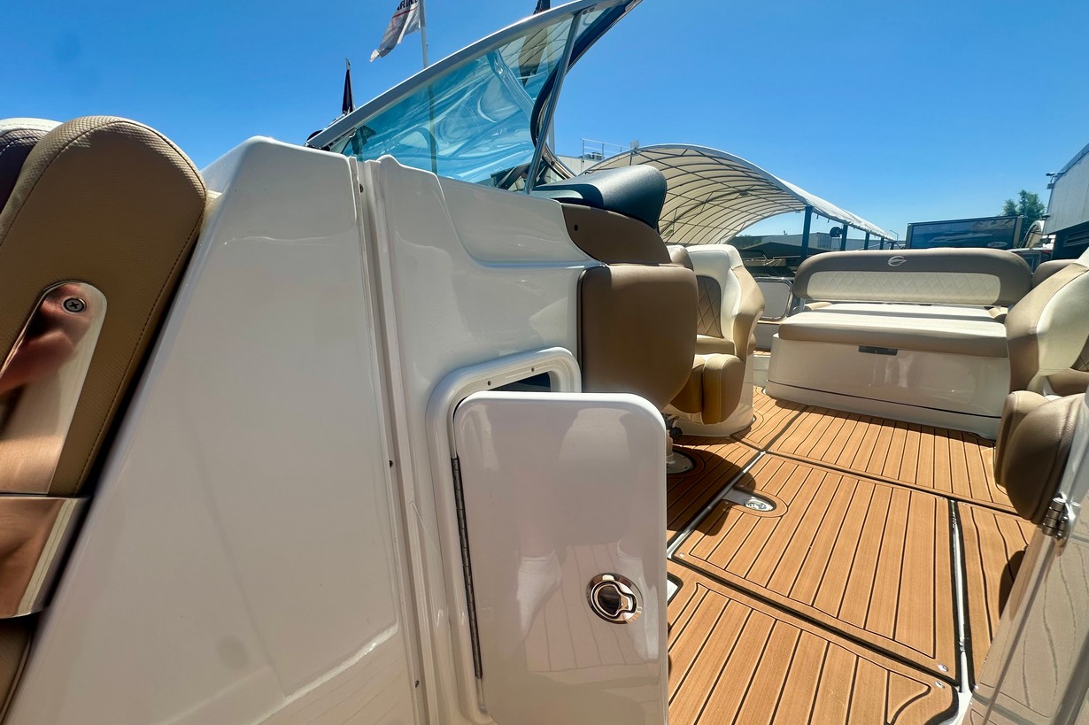 With its spacious layout, the Crownline E235 ensures everyone can enjoy the ride in comfort. Whether you’re lounging on the plush bow seats or taking on the helm for an exhilarating ride, you’ll appreciate the smart design that maximizes both space and functionality. From the intuitive Garmin touchscreen, or the powerful sound system, or the extended swim platform, every feature has been crafted for a seamless experience on the water. The E235 is all about effortless cruising, smooth handling, and unbeatable fun.