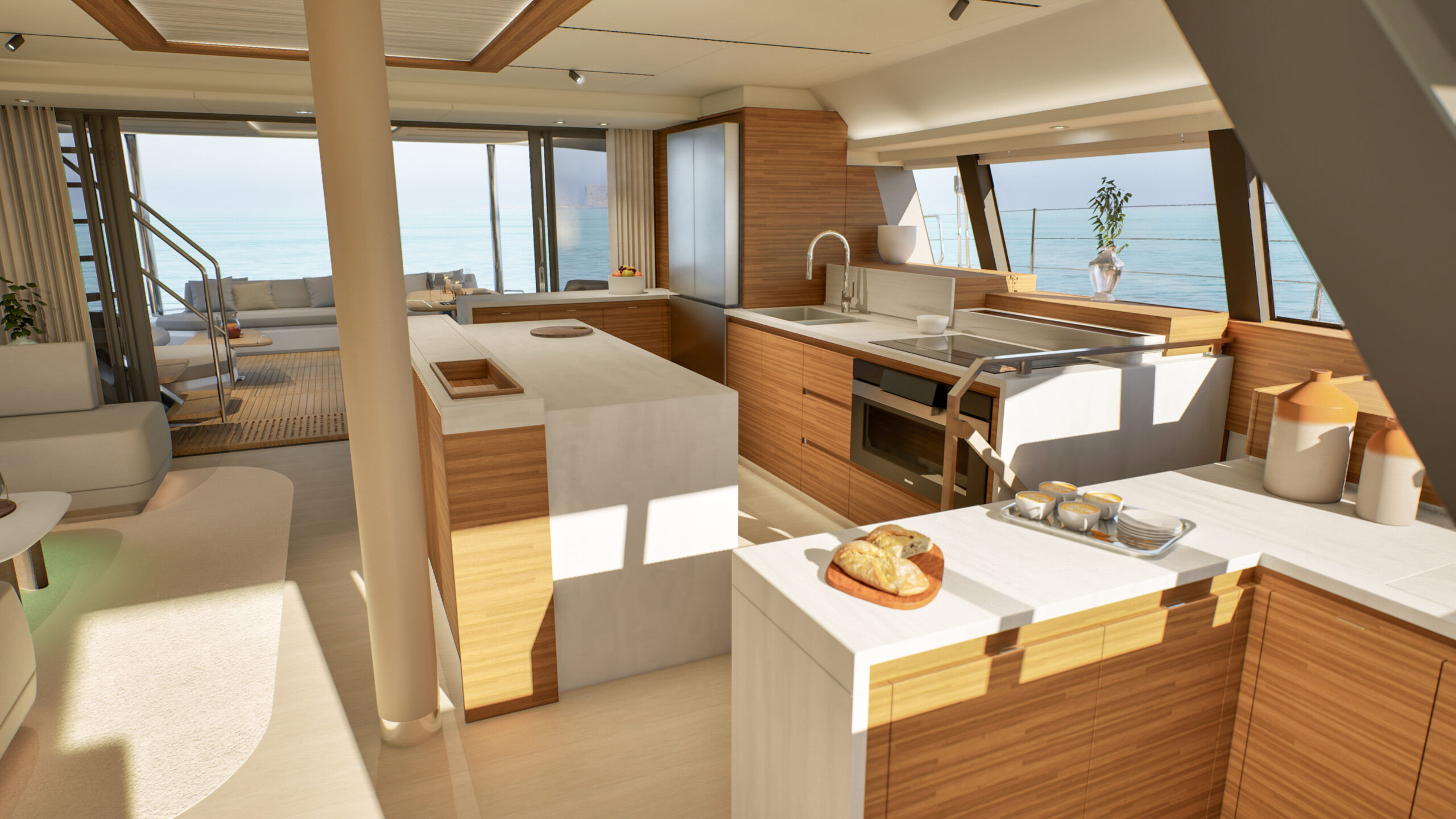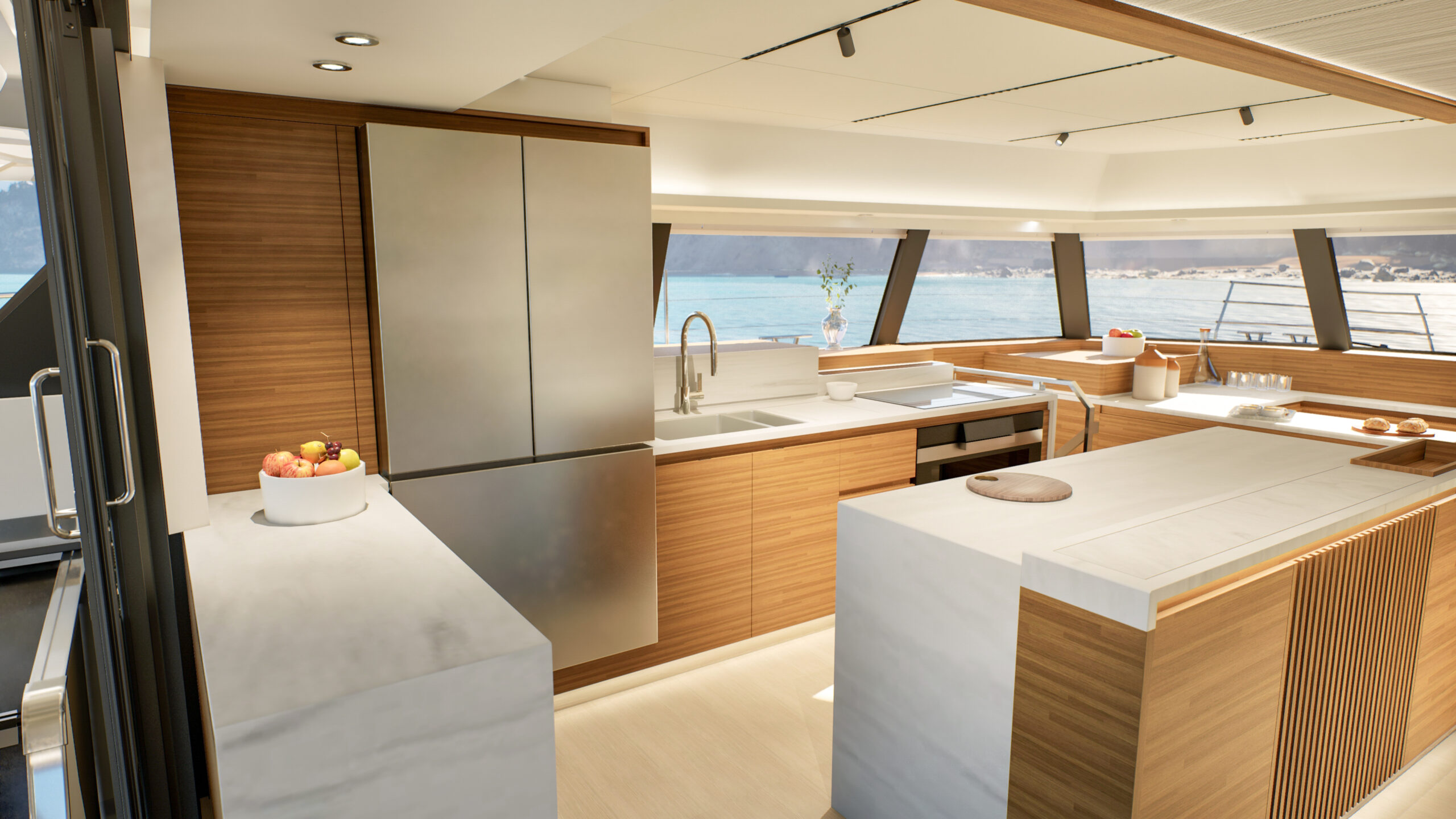 Options include 3 to 6 guest cabins and up to 5 crew cabins, with the galley positioned either on the main deck or below. A refined palette of materials and finishes allows further personalisation, while Fountaine Pajot’s design team can deliver fully bespoke solutions. Discreet, professional service is ensured with 34 m² dedicated to crew, including a captain’s cabin with en-suite.
