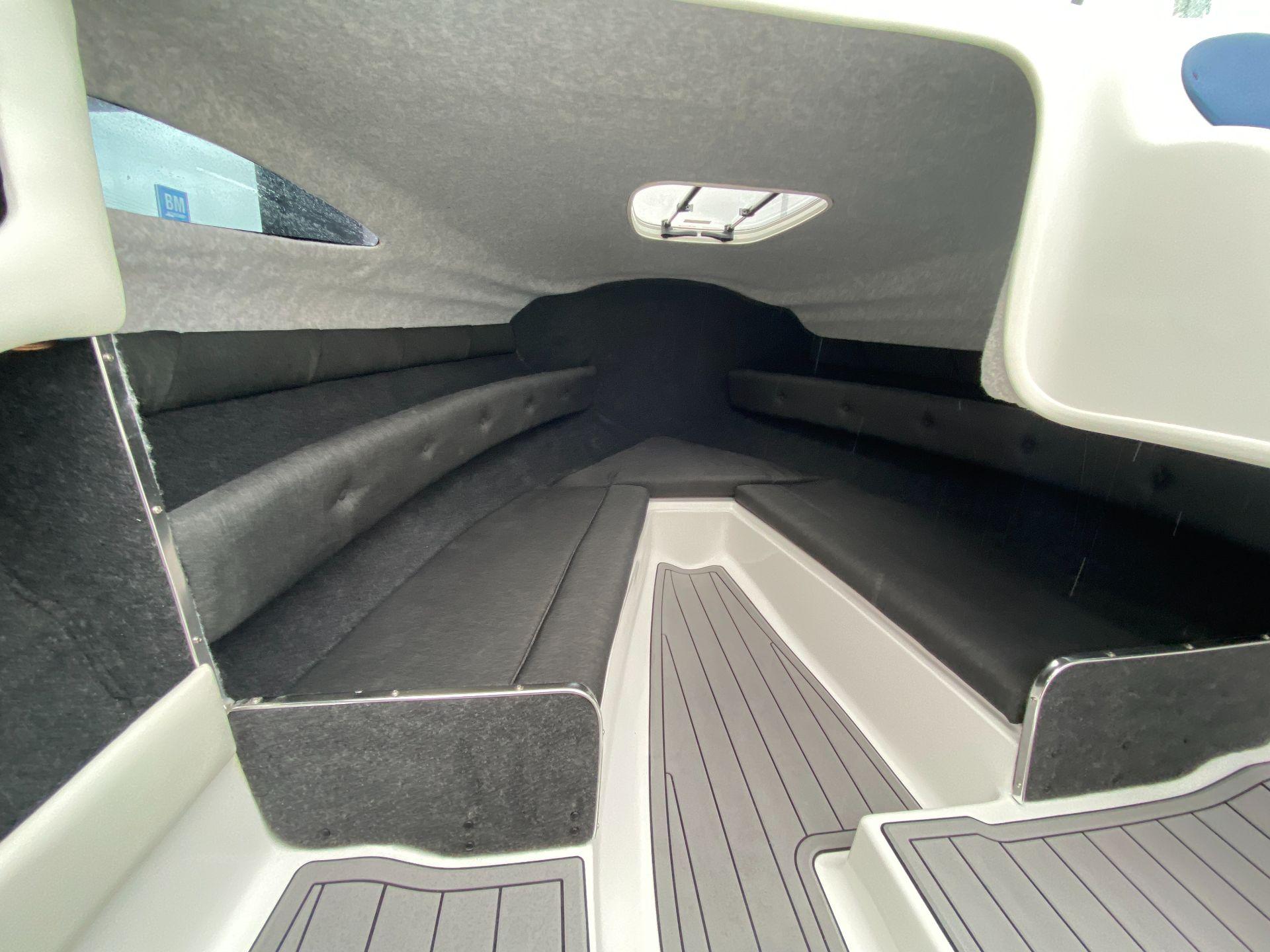 Completed with a blue & white vinyl seating combo and complemented with Sea Deck throughout, you will be boating in style all day long. When the weather turns, you’ll have the added protection and safety that a cabin provides. Storage isn’t an issue with large storage pockets that run the length of the cockpit as well as a dedicated ski storage locker.